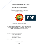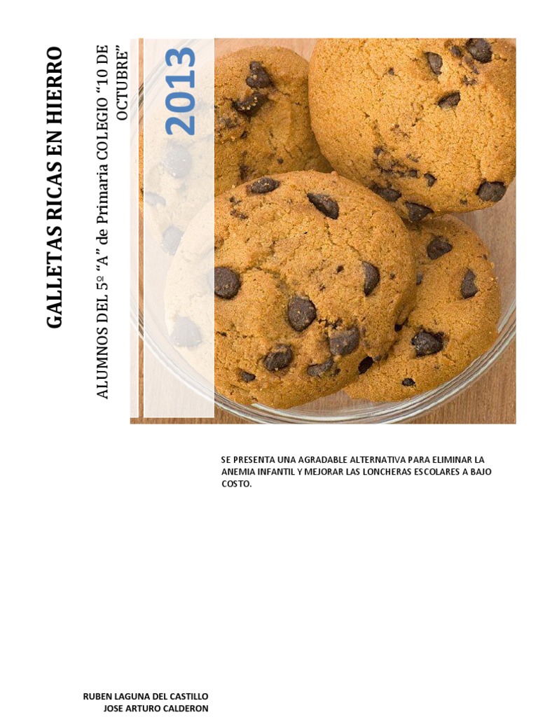 El Ministerio de Educacin, desde hace varios aos, viene fomentando las instalaciones de Kioskos Saludables que contribuyan a su vez con una Lonchera Saludable, propiciando buenos hbitos alimenticios con refrigerios nutritivos y econmicos. De preferencia de origen autctonos de nuestro pas, como bolas de kiwicha, kekes de quinua, galletas de sangrecita de pollo, etc, etc. Haciendo de estos alimentos, no solo la delicia de nios para mitigar el apetito, sino buscando preservar y mejorar la salud infantil. Es as que el Ministerio de Salud, viene desarrollando campaas para disminuir la Anemia Infantil a travs de alimentos econmicos al alcance de toda la poblacin, haciendo diversas recetas a base de la SANGRECITA DE POLLO, quien con solo 30 gr al dia de este alimento, nos permite cubrir toda nuestra necesidad de hierro en un da por persona evitando asi la presencia de la ANEMIA, enfermedad que impide mantener la concentracin de los estudiantes, hacindolos sentir adormitados y cansados. As mismo se puede presentar como alternativa de ingreso econmico y crear en los nios buenos hbitos alimenticios que protejan su salud y hacindolos consientes que la alimentacin no es llenar la barriga o calmar el hambre, sino que es ms bien nutrirnos y estar saludables. Es por este motivo que hemos preparado el presente proyecto de Galletas de Hierro, para orientar sobre la incorporacin de fuentes de hierro en la alimentacin diaria que ayuden a prevenir la anemia y la desnutricin.