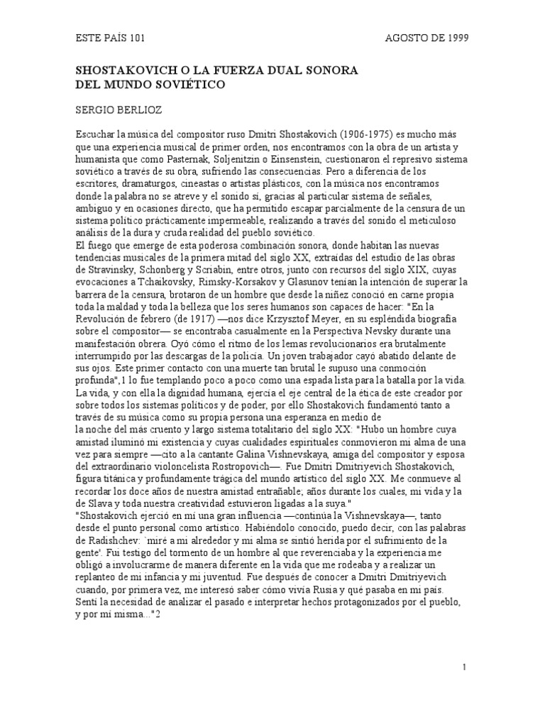 SERGIO BERLIOZ Escuchar la msica del compositor ruso Dmitri Shostakovich (1906-1975) es mucho ms que una experiencia musical de primer orden, nos encontramos con la obra de un artista y humanista que como Pasternak, Soljenitzin o Einsenstein, cuestionaron el represivo sistema sovitico a travs de su obra, sufriendo las consecuencias. Pero a diferencia de los escritores, dramaturgos, cineastas o artistas plsticos, con la msica nos encontramos donde la palabra no se atreve y el sonido s, gracias al particular sistema de seales, ambiguo y en ocasiones directo, que ha permitido escapar parcialmente de la censura de un sistema poltico prcticamente impermeable, realizando a travs del sonido el meticuloso anlisis de la dura y cruda realidad del pueblo sovitico. El fuego que emerge de esta poderosa combinacin sonora, donde habitan las nuevas tendencias musicales de la primera mitad del siglo XX, extradas del estudio de las obras de Stravinsky, Schonberg y Scriabin, entre otros, junto con recursos del siglo XIX, cuyas evocaciones a Tchaikovsky, Rimsky-Korsakov y Glasunov tenan la intencin de superar la barrera de la censura, brotaron de un hombre que desde la niez conoci en carne propia toda la maldad y toda la belleza que los seres humanos son capaces de hacer: "En la Revolucin de febrero (de 1917) nos dice Krzysztof Meyer, en su esplndida biografa sobre el compositor se encontraba casualmente en la Perspectiva Nevsky durante una manifestacin obrera. Oy cmo el ritmo de los lemas revolucionarios era brutalmente interrumpido por las descargas de la polica. Un joven trabajador cay abatido delante de sus ojos. Este primer contacto con una muerte tan brutal le supuso una conmocin profunda",1 lo fue templando poco a poco como una espada lista para la batalla por la vida. La vida, y con ella la dignidad humana, ejerca el eje central de la tica de este creador por sobre todos los sistemas polticos y de poder, por ello Shostakovich fundament tanto a travs de su msica como su propia persona una esperanza en medio de la noche del ms cruento y largo sistema totalitario del siglo XX: "Hubo un hombre cuya amistad ilumin mi existencia y cuyas cualidades espirituales conmovieron mi alma de una vez para siempre cito a la cantante Galina Vishnevskaya, amiga del compositor y esposa del extraordinario violoncelista Rostropovich. Fue Dmitri Dmitriyevich Shostakovich, figura titnica y profundamente trgica del mundo artstico del siglo XX. Me conmueve al recordar los doce aos de nuestra amistad entraable; aos durante los cuales, mi vida y la de Slava y toda nuestra creatividad estuvieron ligadas a la suya." "Shostakovich ejerci en m una gran influencia contina la Vishnevskaya, tanto desde el punto personal como artstico. Habindolo conocido, puedo decir, con las palabras de Radishchev: `mir a mi alrededor y mi alma se sinti herida por el sufrimiento de la gente'. Fui testigo del tormento de un hombre al que reverenciaba y la experiencia me oblig a involucrarme de manera diferente en la vida que me rodeaba y a realizar un replanteo de mi infancia y mi juventud. Fue despus de conocer a Dmitri Dmitriyevich cuando, por primera vez, me interes saber cmo viva Rusia y qu pasaba en mi pas. Sent la necesidad de analizar el pasado e interpretar hechos protagonizados por el pueblo, y por m misma..."2