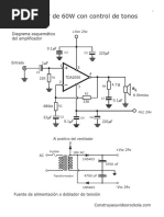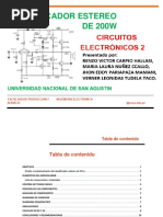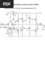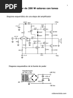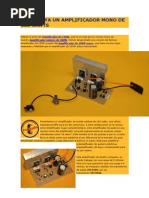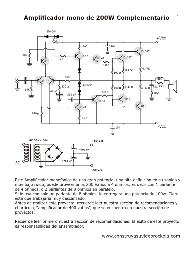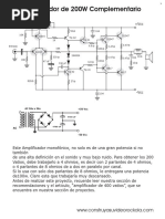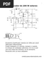 Este Amplificador monofnico de una gran potencia, una alta definicin en su sonido y muy bajo ruido, puede proveer unos 200 Vatios a 4 ohmios, es decir con 1 parlante de 4 ohmios, o 2 parlantes de 8 ohmios en paralelo. Si lo usa con solo un parlante de 8 ohmios, le entregara una potencia de 100w. Claro est que trabajara muy descansado. Antes de realizar este proyecto, recuerde leer nuestra seccin de recomendaciones y el articulo, amplificador de 400 vatios, que se encuentra en nuestra seccin de proyectos. Recuerde leer primero nuestra seccin de recomendaciones. El xito de este proyecto es responsabilidad del ensamblador.