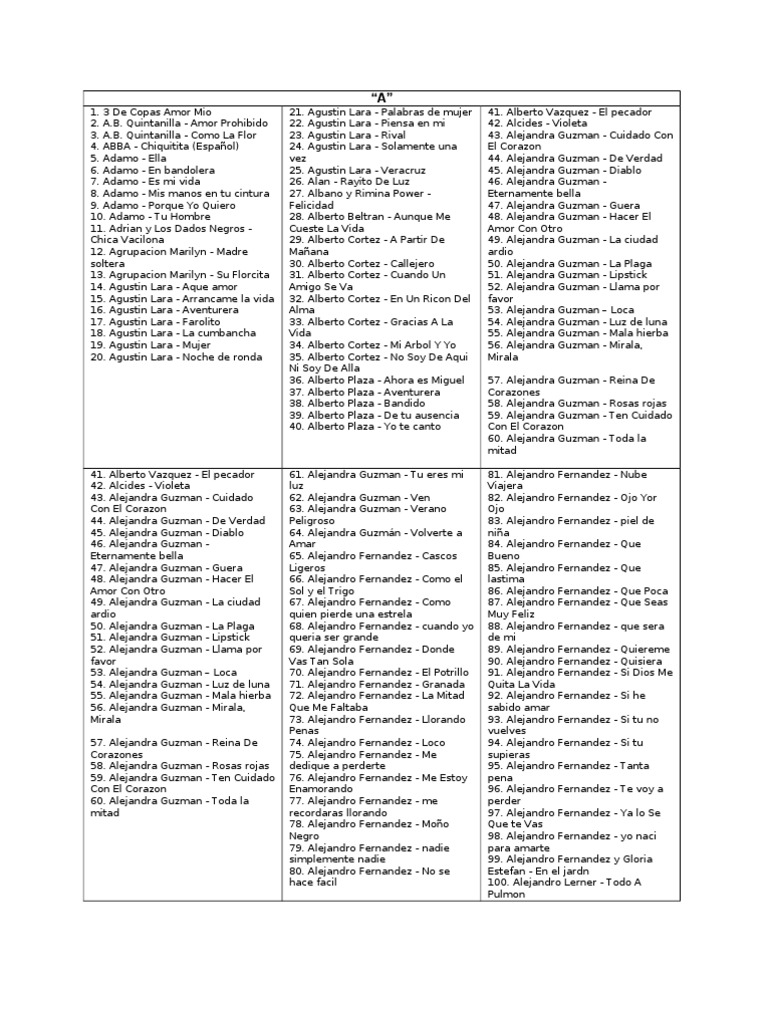 101. Alejandro Sanz - AMIGA MIA 102. Alejandro Sanz - Aprendiz 103. Alejandro Sanz - AQUELLO QUE ME DISTE 104. Alejandro Sanz - CORAZON PARTIDO 105. Alejandro Sanz - Cuando nadie me ve 106. Alejandro Sanz - Enseame tus manos 107. Alejandro Sanz - Lo Que Fui Es Lo Que Soy 108. Alejandro Sanz - No Es Lo Mismo 109. Alejandro Sanz - Pisando Fuerte 110. Alejandro Sanz - quiero morir en tu veneno 111. Alejandro Sanz - Si tu me miras 112. Alejandro Sanz - y si fuera ella 113. Alejandro Sanz y Shakira - Te Lo Agradezco Pero No 114. Alejandro y Vicente - De que manera te olvido 115. Alejandro y Vicente - El rey 116. Alejandro y Vicente - Tu camino y el mio 117. Alek Syntek y Ana Torroja Duele el amor 118. Aleks Syntek - De noche por la ciudad 119. Aleks Syntek - Intocable 120. Aleks Syntek - Por Volverte A Ver 161. Americo - Tendria Que Llorar Por Ti 162. Amparo Rubin - No El No Es Un Rocky 163. Ana Barbara - Sacudeme 164. Ana Gabrial - Ahora 165. Ana Gabriel - A Pesar De Todos 166. Ana Gabriel - Ay Amor 167. Ana Gabriel - Es Demasiado Tarde 168. Ana Gabriel - Es El Amor Quien Llega 169. Ana Gabriel - Evidencias 170. Ana Gabriel - Hablame De Frente 171. Ana Gabriel - Huelo A Soledad 172. Ana Gabriel - Luna 173. Ana Gabriel - Mar Y Arena 174. Ana Gabriel - No a pedir perdon 175. Ana Gabriel - Pacto De Amor 176. Ana Gabriel - Pecado Original 177. Ana Gabriel - Quien Como Tu 178. Ana Gabriel - Simplemente Amigos 179. Ana Gabriel Y Vicky Carr Cosas Del Amor 180. Anahi - Desesperadamente Sola