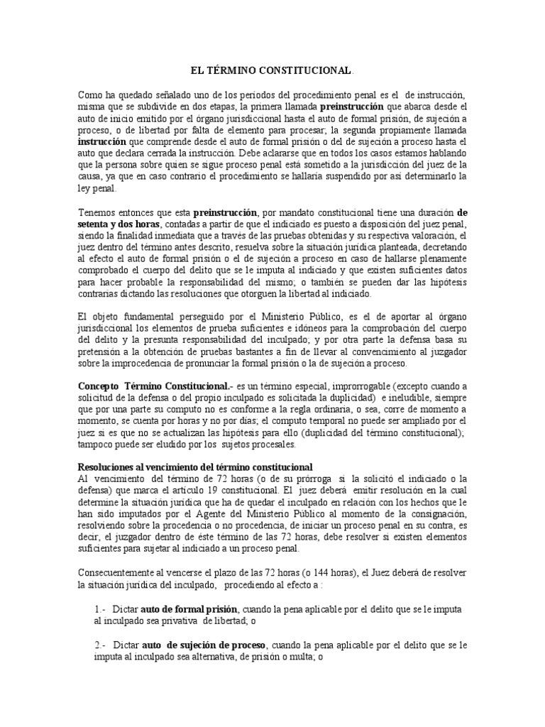 Como ha quedado sealado uno de los perodos del procedimiento penal es el de instruccin, misma que se subdivide en dos etapas, la primera llamada preinstruccin que abarca desde el auto de inicio emitido por el rgano jurisdiccional hasta el auto de formal prisin, de sujecin a proceso, o de libertad por falta de elemento para procesar; la segunda propiamente llamada instruccin que comprende desde el auto de formal prisin o del de sujecin a proceso hasta el auto que declara cerrada la instruccin. Debe aclararse que en todos los casos estamos hablando que la persona sobre quien se sigue proceso penal est sometido a la jurisdiccin del juez de la causa, ya que en caso contrario el procedimiento se hallara suspendido por as determinarlo la ley penal. Tenemos entonces que esta preinstruccin, por mandato constitucional tiene una duracin de setenta y dos horas, contadas a partir de que el indiciado es puesto a disposicin del juez penal, siendo la finalidad inmediata que a travs de las pruebas obtenidas y su respectiva valoracin, el juez dentro del trmino antes descrito, resuelva sobre la situacin jurdica planteada, decretando al efecto el auto de formal prisin o el de sujecin a proceso en caso de hallarse plenamente comprobado el cuerpo del delito que se le imputa al indiciado y que existen suficientes datos para hacer probable la responsabilidad del mismo; o tambin se pueden dar las hiptesis contrarias dictando las resoluciones que otorguen la libertad al indiciado. El objeto fundamental perseguido por el Ministerio Pblico, es el de aportar al rgano jurisdiccional los elementos de prueba suficientes e idneos para la comprobacin del cuerpo del delito y la presunta responsabilidad del inculpado; y por otra parte la defensa basa su pretensin a la obtencin de pruebas bastantes a fin de llevar al convencimiento al juzgador sobre la improcedencia de pronunciar la formal prisin o la de sujecin a proceso. Concepto Trmino Constitucional.- es un trmino especial, improrrogable (excepto cuando a solicitud de la defensa o del propio inculpado es solicitada la duplicidad) e ineludible, siempre que por una parte su computo no es conforme a la regla ordinaria, o sea, corre de momento a momento, se cuenta por horas y no por das; el computo temporal no puede ser ampliado por el juez si es que no se actualizan las hiptesis para ello (duplicidad del trmino constitucional); tampoco puede ser eludido por los sujetos procesales. Resoluciones al vencimiento del trmino constitucional Al vencimiento del trmino de 72 horas (o de su prrroga si la solicit el indiciado o la defensa) que marca el artculo 19 constitucional. El juez deber emitir resolucin en la cual determine la situacin jurdica que ha de quedar el inculpado en relacin con los hechos que le han sido imputados por el Agente del Ministerio Pblico al momento de la consignacin, resolviendo sobre la procedencia o no procedencia, de iniciar un proceso penal en su contra, es decir, el juzgador dentro de ste trmino de las 72 horas, debe resolver si existen elementos suficientes para sujetar al indiciado a un proceso penal. Consecuentemente al vencerse el plazo de las 72 horas (o 144 horas), el Juez deber de resolver la situacin jurdica del inculpado, procediendo al efecto a : 1.- Dictar auto de formal prisin, cuando la pena aplicable por el delito que se le imputa al inculpado sea privativa de libertad; o 2.- Dictar auto de sujecin de proceso, cuando la pena aplicable por el delito que se le imputa al inculpado sea alternativa, de prisin o multa; o