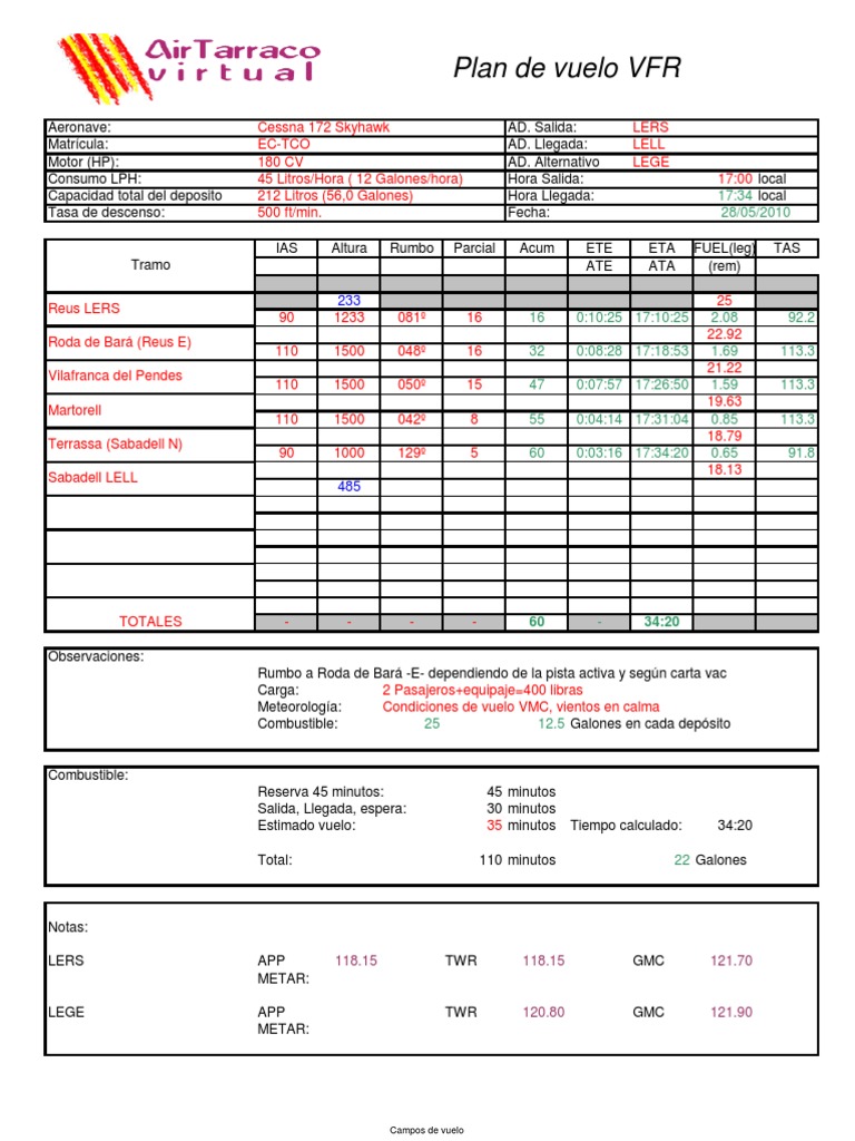 Aeronave: Matrcula: Motor (HP): Consumo LPH: Capacidad total del deposito Tasa de descenso: Cessna 172 Skyhawk EC-TCO 180 CV 45 Litros/Hora ( 12 Galones/hora) 212 Litros (56,0 Galones) 500 ft/min. IAS Tramo Reus LERS Roda de Bar (Reus E) Vilafranca del Pendes Martorell Terrassa (Sabadell N) Sabadell LELL 233 1233 1500 1500 1500 1000 485 Altura Rumbo Parcial AD. Salida: AD. Llegada: AD. Alternativo Hora Salida: Hora Llegada: Fecha: Acum ETE ATE LERS LELL LEGE 17:00 local 17:34 local 28/05/2010 ETA ATA FUEL(leg) (rem) 25 2.08 22.92 1.69 21.22 1.59 19.63 0.85 18.79 0.65 18.13 TAS