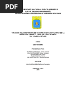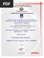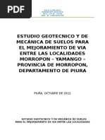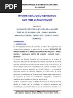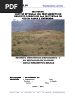 ALCANCE Y METODOLOGA DEL ESTUDIO Durante el reconocimiento geolgico a detalle a lo largo de la va se ha realizado la definicin del tipo de material para excavar, su comportamiento mecnico; se han analizado los taludes de la va existente y se han recomendado los cortes que debera tener la va durante la construccin. Inicialmente, fue revisada toda la informacin geolgica existente a escala regional en base al mapa a escala 1:100 000 y se han observado las fotos areas de la zona para definir las unidades litolgicas presentes en el sector y tambin para ubicar las fallas geolgicas que interfieren en el proyecto. Luego, se ha realizado el mapeo en el campo para unificar las unidades geolgicas a escala 1:2000 con la respectiva descripcin geolgica-geotcnica de las rocas y suelos y las condiciones climticas, morfolgicas, geodinmicas; con definicin de los rasgos estructurales de las rocas que influyen en el comportamiento geotcnico de las mismas.