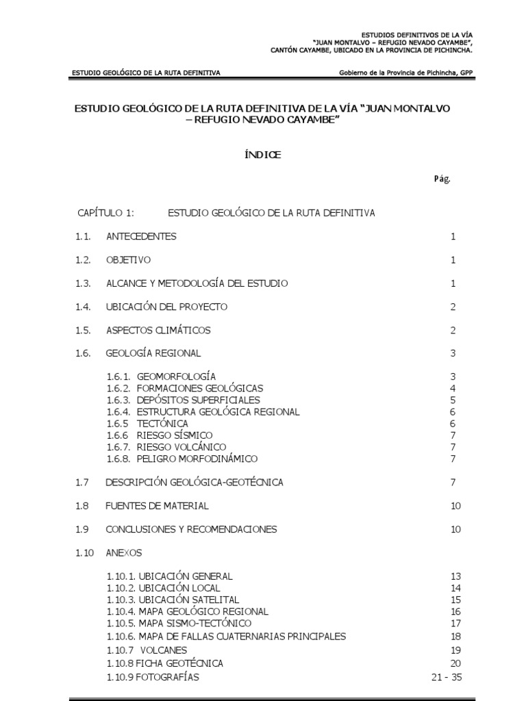 ESTUDIO GEOLGICO DE LA RUTA DEFINITIVA DE LA VA JUAN MONTALVO REFUGIO NEVADO CAYAMBE NDICE Pg. CAPTULO 1: 1.1. 1.2. 1.3. 1.4. 1.5. 1.6. ESTUDIO GEOLGICO DE LA RUTA DEFINITIVA 1 1 1 2 2 3 3 4 5 6 6 7 7 7 7 10 10