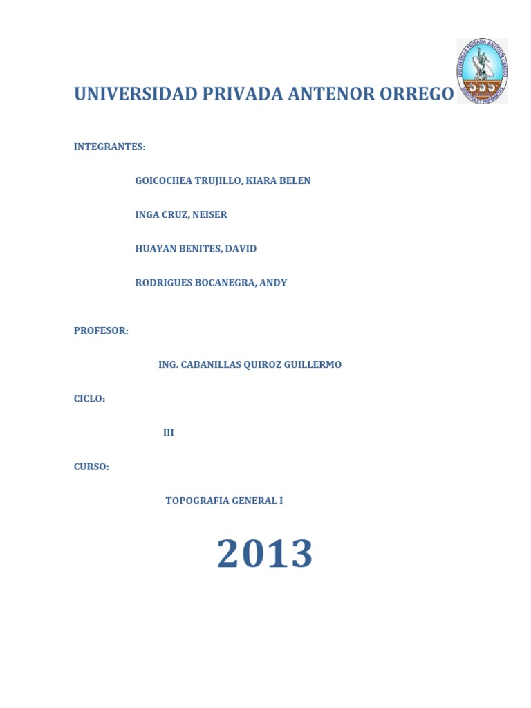 PROFESOR: ING. CABANILLAS QUIROZ GUILLERMO CICLO: III CURSO: TOPOGRAFIA GENERAL I