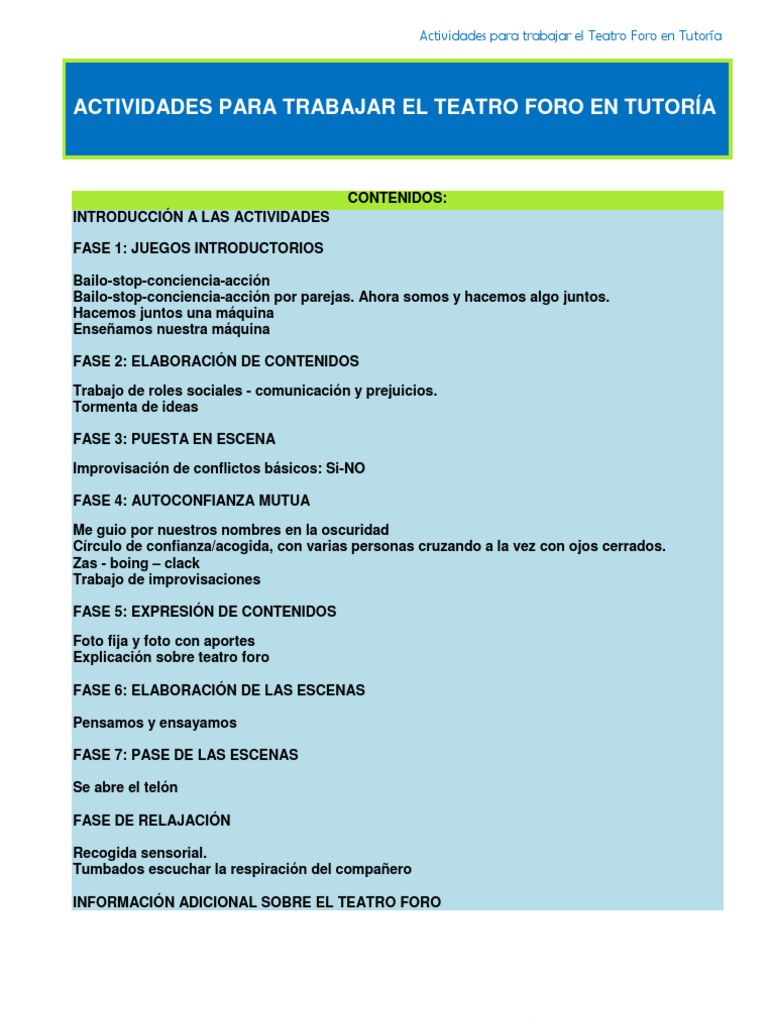 Actividades para trabajar el Teatro Foro en Tutora INTRODUCCIN El taller de teatro foro en tutora tiene dos partes diferenciadas, divididas en siete fases: 1 parte: Juegos dramticos y cooperativos de calentamiento, extraccin de contenidos, de la fase 1 a la fase 5. 2 parte: Elaboracin y puesta en escena de los contenidos anteriormente identificados y presentacin de las escenas de teatro foro, fases 6 y 7.