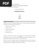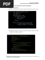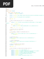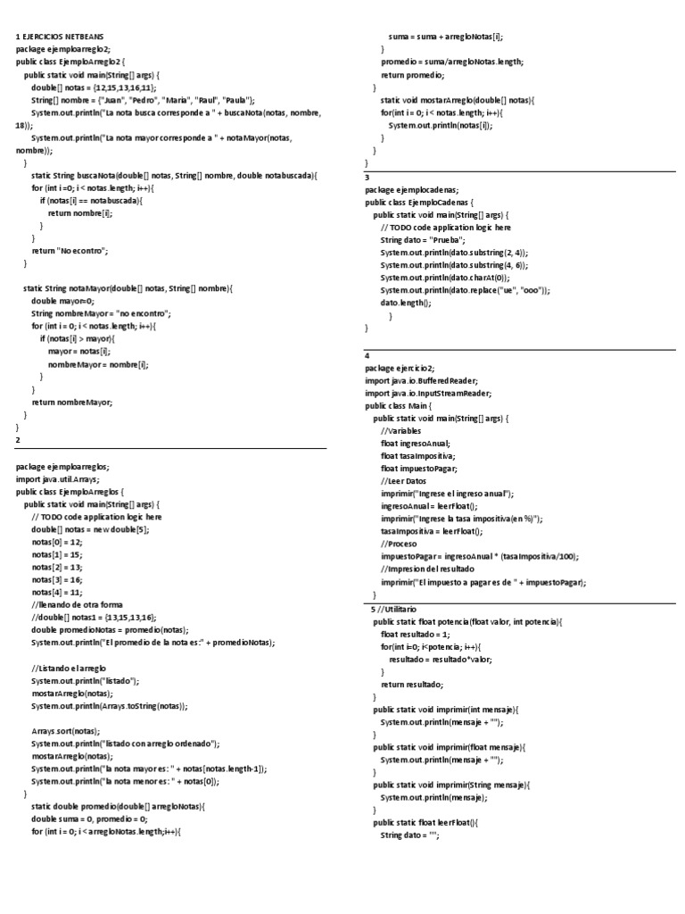 suma = suma + arregloNotas[i]; } promedio = suma/arregloNotas.length; return promedio; } static void mostarArreglo(double[] notas){ for(int i = 0; i < notas.length; i++){ System.out.println(notas[i]); } } } 3 package ejemplocadenas; public class EjemploCadenas { public static void main(String[] args) { // TODO code application logic here String dato = "Prueba"; System.out.println(dato.substring(2, 4)); System.out.println(dato.substring(4, 6)); System.out.println(dato.charAt(0)); System.out.println(dato.replace("ue", "ooo")); dato.length(); } } 4 package ejercicio2; import java.io.BufferedReader; import java.io.InputStreamReader; public class Main { public static void main(String[] args) { //Variables float ingresoAnual; float tasaImpositiva; float impuestoPagar; //Leer Datos imprimir("Ingrese el ingreso anual"); ingresoAnual = leerFloat(); imprimir("Ingrese la tasa impositiva(en %)"); tasaImpositiva = leerFloat(); //Proceso impuestoPagar = ingresoAnual * (tasaImpositiva/100); //Impresion del resultado imprimir("El impuesto a pagar es de " + impuestoPagar); } 5 //Utilitario public static float potencia(float valor, int potencia){ float resultado = 1; for(int i=0; i<potencia; i++){ resultado = resultado*valor; } return resultado; } public static void imprimir(int mensaje){ System.out.println(mensaje + ""); } public static void imprimir(float mensaje){ System.out.println(mensaje + ""); } public static void imprimir(String mensaje){ System.out.println(mensaje); } public static float leerFloat(){ String dato = "";