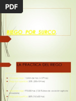 Sistema de riegos por surco: Tomamos en consideracin este mtodo por: Es un mtodo que se adopta a la mayora de las texturas del suelo. Es un mtodo que se aplica en diversas pendientes Este mtodo es ms apropiado para cultivos que se siembran en hileras como: maz, algodn, verduras, caa de azcar, etc. En este mtodo la aplicacin del agua es ms econmica cuando las pendientes no son ms del 3% Caractersticas del surco: Considerando la topografa del terreno se estima una pendiente del 0.4 % Ancho de surco: 60 cm. Separacin entre surcos: 60 cm. Distancia de golpe: 30 cm. Longitud del surco La dimensin del surco est en funcin de la textura del suelo y la pendiente, Estas dimensiones oscilan entre los 120 180 metros, a dems considerado la topografa del terreno se tendr 12 parcelas en riego con un promedio de 130 m de longitud Calculando el tiempo de mojado mediante la frmula: