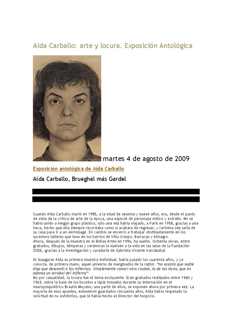 Cuando Ada Carballo muri en 1985, a la edad de sesenta y nueve aos, era, desde el punto de vista de la crtica de arte de la poca, una especie de personaje mtico y extrao. No se haba unido a ningn grupo plstico, slo una vez haba viajado, a Pars en 1958, gracias a una beca, hecho que ella siempre recordaba como si acabara de regresar, y rarsima vez sala de su casa para ir a un vernissage. En cambio se encerr a trabajar obstinadamente en los sucesivos talleres que tuvo en los barrios de Villa Crespo, Barracas y Almagro. Ahora, despus de la muestra en el Bellas Artes en 1996, ha vuelto. Ochenta obras, entre grabados, dibujos, tmperas y cermicas la vuelven a la vida en las salas de la Fundacin OSDE, gracias a la investigacin y curadura de Gabriela Vicente Irarrzabal. Al inaugurar Ada su primera muestra individual, haba pasado los cuarenta aos, y ya conoca, de primera mano, aquel universo de marginados de la razn: no acepto que nadie diga que descend a los infiernos. Simplemente conoc otra ciudad, la de los locos, que es apenas un arrabal del infierno. No por casualidad, la locura fue el tema excluyente. Eran grabados realizados entre 1960 y 1963, sobre la base de los bocetos a lpiz tomados durante su internacin en el neuropsiquitrico Braulio Moyano; una parte de ellos, se exponen ahora por primera vez. La mayora de esos apuntes, estuvieron guardados cincuenta aos, Ada haba respetado la solicitud de no exhibirlos, que le haba hecho el Director del hospicio.