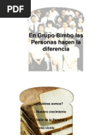 Hoy en da Grupo Bimbo es la panificadora ms importante del mundo. Grupo Bimbo tiene presencia en 19 pases de Amrica, Asia y Europa, cuenta con cerca de 10,000 productos y con ms de 103 marcas de reconocido prestigio. Finalidad Misin Alimentar, Deleitar y Servir a nuestro mundo. Visin En nuestra Visin 2015 SOMOS: Una empresa con marcas lderes y confiables para nuestros consumidores. El proveedor preferido de nuestros clientes. Una empresa innovadora, que mira hacia el futuro. Una empresa financieramente slida. Un lugar extraordinario para trabajar. En 2015 somos la mejor empresa de panificacin en el mundo y un lder de la industria alimenticia, donde nuestra gente hace la diferencia todos los das. Buscamos ser una empresa altamente productiva y plenamente humana. Valores PASION: Servimos con Pasin, Nos entregamos en todo lo que hacemos. EQUIPO: Trabajamos en Equipo, Colaboramos, sumamos esfuerzos, multiplicamos logros. CONFIANZA: Construimos Confianza, Cultivamos cada relacin con integridad.