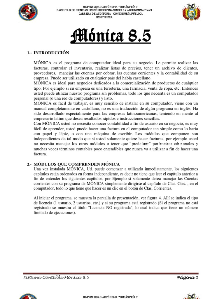 1.- INTRODUCCIN MNICA es el programa de computador ideal para su negocio. Le permite realizar las facturas, controlar el inventario, realizar listas de precios, tener un archivo de clientes, proveedores, manejar las cuentas por cobrar, las cuentas corrientes y la contabilidad de su empresa. Puede ser utilizado en cualquier pas del habla castellano. MNICA es ideal para negocios dedicados a la comercializacin de productos de cualquier tipo. Por ejemplo si su empresa es una ferretera, una farmacia, venta de ropa, etc. Entonces usted puede utilizar nuestro programa sin problemas, todo los que necesita es un computador personal (o una red de computadores) y listo. MNICA es fcil de trabajar, es muy sencillo de instalar en su computador, viene con un manual completamente en castellano, no es una traduccin de algn programa en ingls. Ha sido desarrollado especialmente para las empresas latinoamericanas, teniendo en mente al empresario latino que desea resultados rpidos e instrucciones sencillas. Con MNICA usted no necesita conocer contabilidad a fin de usuario en su negocio, es muy fcil de aprender, usted puede hacer una factura en el computador tan simple como lo hara con papel y lpiz, o con una mquina de escribir. Los mdulos que componen son independientes de tal modo que si usted solamente quiere hacer facturas, por ejemplo usted no necesita manejar los otros mdulos o tener que predefinir parmetros adicionales y muchas veces trminos contables poco entendibles que nunca va a utilizar a fin de hacer una factura.