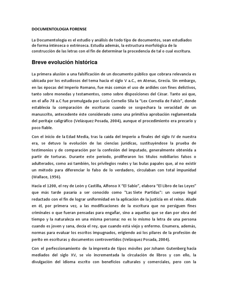 la grafologa moderna porque fue l, junto a Desbarrolles, quien desarroll el primer mtodo de interpretacin psicografolgica. Por su parte, Wilhem Preyer, afirm que la escritura era una manifestacin de la actividad cerebral, y como tal, presenta caractersticas similares independientemente del rgano que la ejecuta; afirmacin que unos aos ms tarde, Edmond Solange Pellat elevara al grado de ley de la escritura, como se ver ms adelante. Tambin la fisiologa hizo su aporte, de la mano del francs Hericourt, quien realiza investigaciones sobre la repercusin de los estados pasajeros de la personalidad en la escritura, centrando la atencin en los movimientos reflejos y el automatismo, desde la perspectiva de su ciencia. Volviendo con el aspecto evolutivo de la forma de anlisis de la escritura, merece la pena recordar la intervencin de Jacques Ravenauy su obra Trait des inscriptions en faux donde consigna consejos para proceder al anlisis comparativo de escrituras, dndole importancia a los trazos que las constituyen por encima de las semejanzas morfolgicas del conjunto, que pueden ser imitadas y llevar a falsas apreciaciones. Durante el pasado siglo XX, con la propagacin y perfeccionamiento de las tcnicas fotogrficas, de la ptica, la informtica, los estudios sobre fuentes alternativas de iluminacin y su aplicabilidad a la cuestin documentolgica, estudios qumico-forenses, etc., tambin se fue mejorando, estructurando y elevando al adecuado nivel de erudicin a la Documentologa y a los profesionales responsables. Anlisis de papel == El perito analiza las caractersticas intrnsecas de elaboracin del papel, sus dimensiones, tamao, textura, color, grosor, y los dispositivos de seguridad.