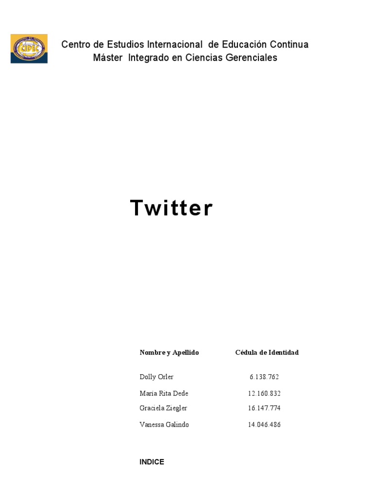 Introduccin... Historia del Twitter.... Que es Twitter.... Utilidad de Twitter..... De donde sali el Nombre del Twitter....... Porqu 140 caracteres......... Como se llama el ave del Twitter ..... Que es Tweet.......... Que es Retweet. Quien escribe Twitter... Que se puede escribir en Twitter Como se enva mensajes otros usuarios . Para que podemos usar Twitter.................................... Conclusiones Ficha Grupal ...