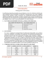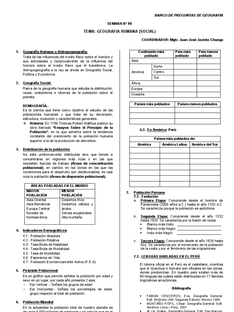 COORDINADOR: Mgtr. Juan Jos Jacinto Chunga 1. Geografa Humana o Antropogeografa: Trata de las influencias del medio fsico sobre el hombre y sus actividades y recprocamente de la influencia del hombre sobre el medio fsico que l transforma. La Antropogeografa a la vez se divide en Geografa Social, Poltica y Econmica. 2. Geografa Social: Rama de la geografa humana que estudia la distribucin, razas, costumbres e idiomas de la poblacin sobre el planeta. DEMOGRAFA.Es la ciencia que tiene como objetivo el estudio de las poblaciones humanas y que trata de su dimensin, estructura, evolucin y caractersticas generales. v Historia: En 1789 Thomas Robert Malthus publico su obra llamada Ensayos Sobre el Principio de la Poblacin, en la que adverta sobre la tendencia constante del crecimiento de la poblacin humana superior a la de la produccin de alimentos. 3. Distribucin de la poblacin: No est uniformemente distribuida sino que tiende a concentrarse en regiones ms ricas o en las que necesitan fuerzas de trabajo (reas de concentracin poblacional), en cambio en las zonas en las que las condiciones para el desarrollo son desfavorables; es casi nula la poblacin (reas de dispersin poblacional). REAS POBLADAS EN EL MUNDO MAYOR MENOR POBLACIN POBLACIN Desiertos fros Asia Oriental Desiertos clidos y Asia Meridional ridos Europa Central Selvas ecuatoriales Noreste de Alta montaa Norteamrica Asia Norte Amrica frica Europa Oceana Pases ms poblados Pases menos poblados Centro Sur Continente ms poblado Pas ms poblado Pas menos poblado