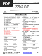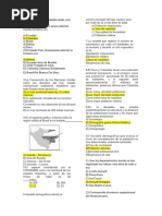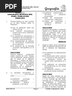 BANCO DE PREGUNTAS DE GEOGRAFIA Coordinador: Mgtr. Juan Jos Jacinto Chunga CUESTIONARIO Son los departamentos menos densos segn el censo del 2007: a) Piura, Cajamarca, La Libertad b) Ucayali, Loreto, Madre de Dios c) Lima, Arequipa, Cajamarca d) Cusco, Loreto, Arequipa e) Lima, Piura, Ucayali De acuerdo a la Encuesta Demogrfica y de Salud Familiar (ENDES 2004), cada ao, resultan embarazadas las adolescentes en el Per, alrededor de: a) 120 mil b) 130 mil c) 40 mil d) 115 mil e) 180 mil Segn el censo del 2007, la densidad poblacional es: a) 30hab/km 2 d) 24hab/km2 2 b) 35hab/km e) 25hab/km2 2 c) 22hab/km En Per, luego de crecer al 2,8% anual en el periodo intercensal 1961-1972, la cifra porcentual, empez a decrecer progresivamente, hasta llegar en el periodo de 1993 2007 a: a) 2,0 anual d) 1,6 anual b) 1,7 anual e) 1,8 anual c) 2,2 anual En Amrica del Sur el Per ocupa el: a) Cuarto lugar d) Tercer alumno b) Quinto lugar e) Sexto lugar c) Stimo lugar En Per, la dependencia demogrfica (poblacin menor de 15 aos y mayor de 65 aos) pas de 65% (1993) a: a) 50% en el 2007 b) 51% en el 2007 c) 52% en el 2007 d) 53% en el 2007 e) 55% en el 2007 La tasa de natalidad en el Per, ha descendido del 42,1 por mil en 1972 a: a) 20 por mil en el 2007 b) 30 por mil en el 2007 c) 24,1 por mil en el 2007 d) 32,5 por mil en el 2007 e) 50 por mil en el 2007 La tasa de mortalidad en el Per, ha descendido del 12,9 por mil en 1972 a. a) 2 por mil en el 2007 b) 3 por mil en el 2007 c) 4,1 por mil en el 2007 d) 2,5 por mil en el 2007 e) 6,1 por mil en el 2007 Casi la mitad de los peruanos vive en ______de 195 provincias que hay en el pas: a) 20 d) 30 b) 10 e) 50 c) 15 10. Las cifras censales del 2007 demuestran, de cada 100 personas 30 tienen menos de: a) 15 aos b) 20 aos c) 30 aos d) 50 aos e) 10 aos 11. Lima sigue siendo el departamento ms poblado del Per, seguido del departamento de: a) Cajamarca b) La Libertad c) Arequipa d) Piura e) Puno 12. Los departamentos de Lima, Piura, La Libertad, Cajamarca y Puno concentran en trminos porcentuales el: a) 45,5% d) 52,5% b) 40,5% e) 40% c) 30,5% 13. Despus de Estados Unidos y Brasil, el pas ms poblado de Amrica es: a) Per b) Argentina c) Mxico d) Canad e) Colombia 14. Los pases ms poblados mundialmente son: a) Rusia - China b) China India c) India Brasil d) Mxico Brasil e) Indonesia Estados Unidos 15. Es el segundo departamento ms denso del Per: a) Puno b) Cajamarca c) Lima d) Lambayeque e) Piura 16. Es el pas menos poblado del mundo: a) Taval b) Nauru c) Vaticano d) Palau e) San Marino 17. Es la regin natural ms extensa del Per y la menos poblada: a) Janca b) Costa c) Selva d) Sierra e) Quechua 18. Es la entrada a un pas de personas que nacieron o proceden de otro lugar: a) Migracin b) Sedentarismo c) Nmada d) Inmigracin e) Emigracin