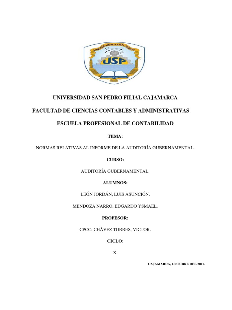 TEMA: NORMAS RELATIVAS AL INFORME DE LA AUDITORA GUBERNAMENTAL. CURSO: AUDITORA GUBERNAMENTAL. ALUMNOS: LEN JORDN, LUIS ASUNCIN. MENDOZA NARRO, EDGARDO YSMAEL. PROFESOR: CPCC: CHVEZ TORRES, VICTOR. CICLO: X.