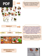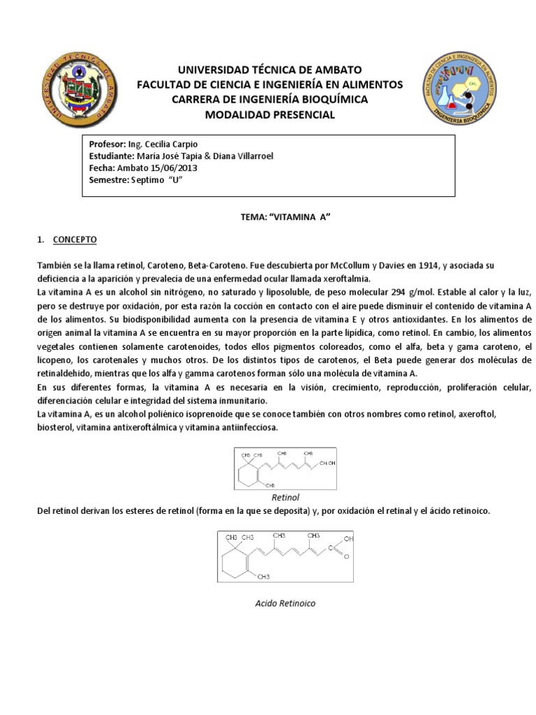 Profesor: Ing. Cecilia Carpio Estudiante: Mara Jos Tapia & Diana Villarroel Fecha: Ambato 15/06/2013 Semestre: Septimo U Prctica: #4 TEMA: VITAMINA A 1. CONCEPTO Tambin se la llama retinol, Caroteno, Beta-Caroteno. Fue descubierta por McCollum y Davies en 1914, y asociada su deficiencia a la aparicin y prevaleca de una enfermedad ocular llamada xeroftalmia. La vitamina A es un alcohol sin nitrgeno, no saturado y liposoluble, de peso molecular 294 g/mol. Estable al calor y la luz, pero se destruye por oxidacin, por esta razn la coccin en contacto con el aire puede disminuir el contenido de vitamina A de los alimentos. Su biodisponibilidad aumenta con la presencia de vitamina E y otros antioxidantes. En los alimentos de origen animal la vitamina A se encuentra en su mayor proporcin en la parte lipdica, como retinol. En cambio, los alimentos vegetales contienen solamente carotenoides, todos ellos pigmentos coloreados, como el alfa, beta y gama caroteno, el licopeno, los carotenales y muchos otros. De los distintos tipos de carotenos, el Beta puede generar dos molculas de retinaldehido, mientras que los alfa y gamma carotenos forman slo una molcula de vitamina A. En sus diferentes formas, la vitamina A es necesaria en la visin, crecimiento, reproduccin, proliferacin celular, diferenciacin celular e integridad del sistema inmunitario. La vitamina A, es un alcohol polinico isoprenoide que se conoce tambin con otros nombres como retinol, axeroftol, biosterol, vitamina antixeroftlmica y vitamina antiinfecciosa.