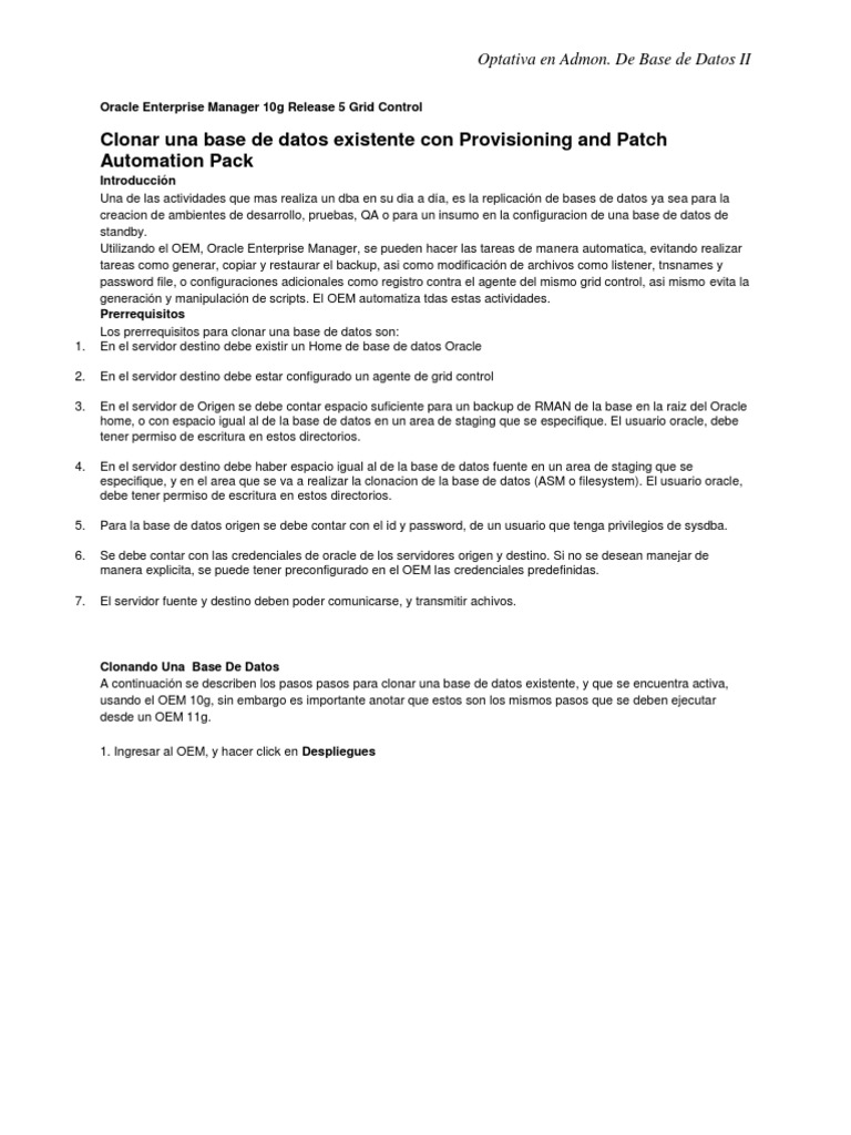 Introduccin Una de las actividades que mas realiza un dba en su dia a da, es la replicacin de bases de datos ya sea para la creacion de ambientes de desarrollo, pruebas, QA o para un insumo en la configuracion de una base de datos de standby. Utilizando el OEM, Oracle Enterprise Manager, se pueden hacer las tareas de manera automatica, evitando realizar tareas como generar, copiar y restaurar el backup, asi como modificacin de archivos como listener, tnsnames y password file, o configuraciones adicionales como registro contra el agente del mismo grid control, asi mismo evita la generacin y manipulacin de scripts. El OEM automatiza tdas estas actividades. Prerrequisitos Los prerrequisitos para clonar una base de datos son: En el servidor destino debe existir un Home de base de datos Oracle En el servidor destino debe estar configurado un agente de grid control En el servidor de Origen se debe contar espacio suficiente para un backup de RMAN de la base en la raiz del Oracle home, o con espacio igual al de la base de datos en un area de staging que se especifique. El usuario oracle, debe tener permiso de escritura en estos directorios. En el servidor destino debe haber espacio igual al de la base de datos fuente en un area de staging que se especifique, y en el area que se va a realizar la clonacion de la base de datos (ASM o filesystem). El usuario oracle, debe tener permiso de escritura en estos directorios. Para la base de datos origen se debe contar con el id y password, de un usuario que tenga privilegios de sysdba. Se debe contar con las credenciales de oracle de los servidores origen y destino. Si no se desean manejar de manera explicita, se puede tener preconfigurado en el OEM las credenciales predefinidas. El servidor fuente y destino deben poder comunicarse, y transmitir achivos.