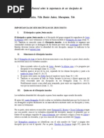 3- San Juan 19,25 -26. El Discpulo permanece fiel. Cuando todos le haban abandonado , cuando muchos de quienes le siguieron miraban de lejos a Jess en la cruz (Lc 23,49), Juan estaba cerca , al pie de la cruz , a los pies de su maestro, fiel , firme , perseverante. Ser discpulo de Jess es la mayor de las gracias, es una dicha, un don, un tesoro y a la vez una exigencia, una tarea, un desafo. Jess es exigente (Jn6, 60) que pide a quienes quieren responder a su iniciativa, a su llamado el negarse a s mismos y tomar la cruz (Mc 8,34), el amarle sobre todas las cosas incluso ms que a sus seres queridos (Lc 14,26), el asumir un plan de vida novedoso y trascendente (Mc 1.17), el renunciar a los apegos materiales y criterios del mundo (Mc 10,17-22), el asumir la persecucin a causa de su nombre (Jn 15,20. Mt 10,18-20) todo esto con la promesa de recibir aun mas, pues Jess no quita nada y lo da todo : Les aseguro, nadie que haya dejado casa, hermanos, hermanas, madre,padre,hijos o haciendo por mi o por el evangelio quedara sin recibir el ciento por uno, ahora al presente casa, hermanos,hermanas,madres, hijos y hacienda, con persecuciones, y en el mundo venidero la vida eterna (Mc 10,29 -30).El discpulo es uno que permanece firme , fiel , perseverante , Jess lo dira como un distintivo de sus verdaderos discpulos: Si se mantienen en mi Palabra sern verdaderamente mis discpulos (Jn 8,31). Nos dice el documento de Aparecida n.140 :