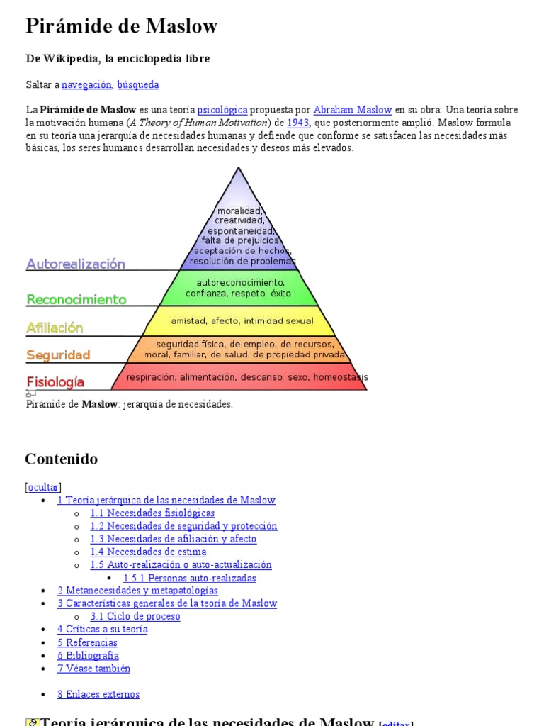 [ocultar] 1 Teora jerrquica de las necesidades de Maslow o 1.1 Necesidades fisiolgicas o 1.2 Necesidades de seguridad y proteccin o 1.3 Necesidades de afiliacin y afecto o 1.4 Necesidades de estima o 1.5 Auto-realizacin o auto-actualizacin 1.5.1 Personas auto-realizadas 2 Metanecesidades y metapatologas 3 Caractersticas generales de la teora de Maslow o 3.1 Ciclo de proceso 4 Crticas a su teora 5 Referencias 6 Bibliografa 7 Vase tambin