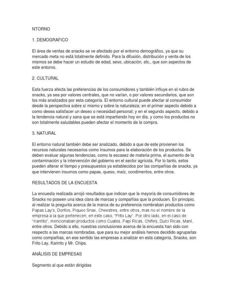 Para la difusin, distribucin y venta de los mismos se debe hacer un estudio de edad, sexo, ubicacin, etc., que son aspectos de este entorno. 2. CULTURAL Esta fuerza afecta las preferencias de los consumidores y tambin influye en el rubro de snacks, ya sea por valores centrales, que no varan, o por valores secundarios, que son los ms analizados por esta categora. El entorno cultural puede afectar al consumidor desde la perspectiva sobre s mismo y sobre la naturaleza; en el primer aspecto debido a como desea satisfacer un deseo o necesidad personal; y en el segundo aspecto, debido a la tendencia natural y sana que se est impartiendo hoy en da, y como los productos no son totalmente saludables pueden afectar el momento de la compra. 3. NATURAL El entorno natural tambin debe ser analizado, debido a que de este provienen los recursos naturales necesarios como insumos para la elaboracin de los productos. Se deben evaluar algunas tendencias, como la escasez de materia prima, el aumento de la contaminacin y la intervencin del gobierno en el sector agrcola. Por lo tanto, estos pueden alterar el tiempo y presupuestos ya establecidos por las compaas de snacks, ya que intervienen insumos como papas, queso, maz, condimentos, entre otros. RESULTADOS DE LA ENCUESTA La encuesta realizada arroj resultados que indican que la mayora de consumidores de Snacks no poseen una idea clara de marcas y compaas que la producen. En principio, al realizar la pregunta acerca de la marca de su preferencia nombraban productos como Papas Lays, Doritos, Piqueo Snax, Cheestres, entre otros, mas no el nombre de la empresa a la que pertenecen, en este caso, Frito Lay. Por otro lado, en el caso de Karinto, mencionaban productos como Cuates, Papi Ricas, Chifles, Dulci Ricas, Man, entre otros. Debido a ello, nuestras conclusiones acerca de la encuesta han sido con respecto a las marcas nombradas, que para su mejor anlisis hemos decidido agruparlas como compaas, en ese sentido las empresas a analizar en esta categora, Snacks, son Frito Lay, Karinto y Mr. Chips. ANLISIS DE EMPRESAS Segmento al que estn dirigidas