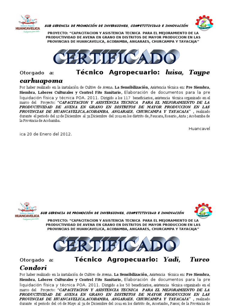 marco del Proyecto: CAPACITACION Y ASISTENCIA TECNICA PARA EL MEJORAMIENTO DE LA PRODUCTIVIDAD DE AVENA EN GRANO EN DISTRITOS DE MAYOR PRODUCCION EN LAS PROVINCIAS DE HUANCAVELICA,ACOBAMBA, ANGARAES, CHURCAMPA Y TAYACAJA , realizado durante el periodo del 09 de Mayo al 31 de Diciembre del 2011 en la Sub Gerencia de Promocion de Inversiones Competitividad e Innovacin.