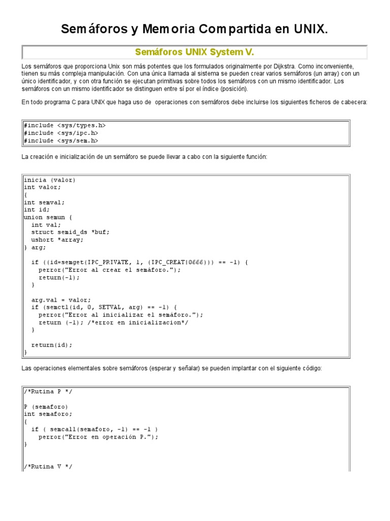 P(semaforo) int semaforo; { if ( semcall(semaforo, -1) == -1 ) perror("Error en operacin P."); } /*Rutina V */ V(semaforo) int semaforo; { if ( semcall(semaforo, 1) == -1 ) perror("Error en operacin V."); } semcall(semaforo, operacion) int semaforo, operacion; { struct sembuf sb; sb.sem_num = 0; sb.sem_op = operacion; sb.sem_flg = 0; return ( semop(semaforo, &sb, 1) ); /*devuelve -1 si error */ } borra_s(semaforo) int semaforo; { if ( semctl(semaforo, 0, IPC_RMID, 0) == -1) { perror("Error al eliminar el semforo."); return(-1); } } Descargar el cdigo fuente de este ejemplo. Para compilar el anterior programa: