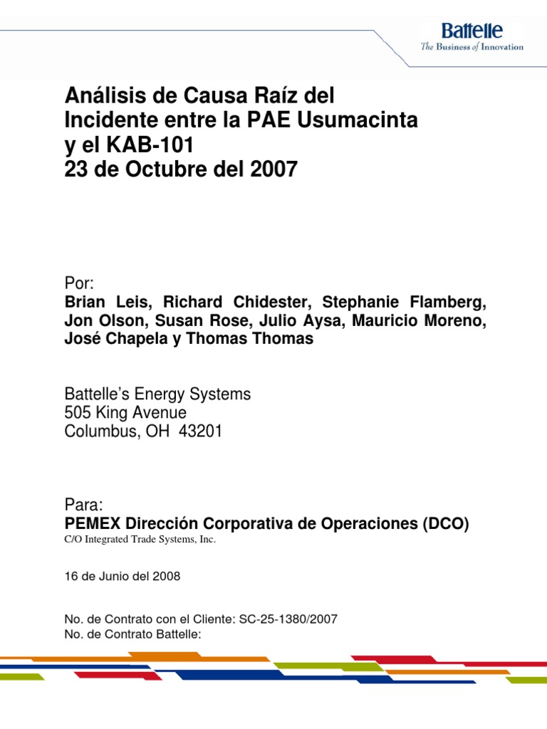 El 23 de octubre de 2007 y en las primeras horas del da siguiente, 22 personas murieron debido a las decisiones y eventos relacionados con la evacuacin/abandono de la unidad de perforacin marina o plataforma auto-elevable (PAE) Usumacinta. La PAE Usumacinta se preparaba para trabajar sobre una pequea plataforma de produccin KAB-101, localizada a unos 18 kilmetros de la costa, al norte de Frontera, Tabasco, Mxico. Entre las personas fallecidas se encontraban empleados de Petrleos Mexicanos (PEMEX), Perforadora Central (PC), Servicios de Comisariato (SERCOMSA) y dos personas de los barcos involucrados en las operaciones de rescate. Como es usual en todo incidente grave, los sobrevivientes, las compaas involucradas y la prensa, intentan dar diversas explicaciones sobre sus causas. Tambin es comn en dichos incidentes que para entender los eventos, sus causas directas y sus causas raz, se requiera una investigacin compleja y laboriosa. Tal investigacin debe buscar dejar satisfechas y confiadas a las partes interesadas, sobre sus conclusiones y recomendaciones. En congruencia con su responsabilidad de procurar la explotacin segura de los recursos de petrleo y gas en Mxico, PEMEX contrat los servicios de Battelle para realizar una investigacin independiente sobre las causas raz del incidente entre la PAE Usumacinta y la plataforma KAB-101. Se solicit a Battelle identificar los factores causales y contribuyentes que subyacen a este incidente, e identificar la causa o causas directas y la causa o causas raz, tan ampliamente como fuera posible dadas las evidencias disponibles. El Anlisis de Causa Raz (ACR) de Battelle se suma a otras dos investigaciones independientes emprendidas por: Una Comisin Especial Independiente (CEI) encabezada por el Premio Nobel de Qumica Dr. Mario Molina, que a su vez ha coordinado las labores de diversos institutos educativos y de investigacin, Una Coordinacin Intergubernamental (CIG), conformado por varias secretaras de estado y agencias gubernamentales, incluyendo a la Procuradura General de la Repblica (PGR), la Secretara del Trabajo y Previsin Social (STPS), la Secretara de la Funcin Pblica (SFP) y la Secretara de Marina (SEMAR), entre otras.