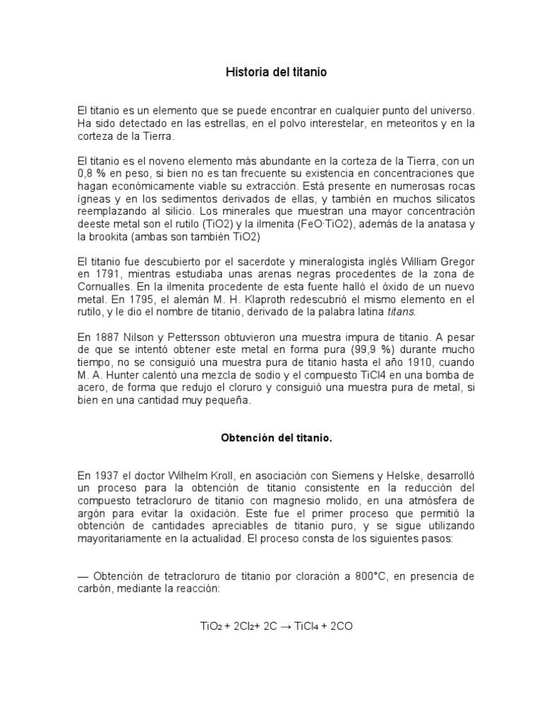 El titanio es un elemento que se puede encontrar en cualquier punto del universo. Ha sido detectado en las estrellas, en el polvo interestelar, en meteoritos y en la corteza de la Tierra. El titanio es el noveno elemento ms abundante en la corteza de la Tierra, con un 0,8 % en peso, si bien no es tan frecuente su existencia en concentraciones que hagan econmicamente viable su extraccin. Est presente en numerosas rocas gneas y en los sedimentos derivados de ellas, y tambin en muchos silicatos reemplazando al silicio. Los minerales que muestran una mayor concentracin deeste metal son el rutilo (TiO2) y la ilmenita (FeOTiO2), adems de la anatasa y la brookita (ambas son tambin TiO2) El titanio fue descubierto por el sacerdote y mineralogista ingls William Gregor en 1791, mientras estudiaba unas arenas negras procedentes de la zona de Cornualles. En la ilmenita procedente de esta fuente hall el xido de un nuevo metal. En 1795, el alemn M. H. Klaproth redescubri el mismo elemento en el rutilo, y le dio el nombre de titanio, derivado de la palabra latina titans. En 1887 Nilson y Pettersson obtuvieron una muestra impura de titanio. A pesar de que se intent obtener este metal en forma pura (99,9 %) durante mucho tiempo, no se consigui una muestra pura de titanio hasta el ao 1910, cuando M. A. Hunter calent una mezcla de sodio y el compuesto TiCl4 en una bomba de acero, de forma que redujo el cloruro y consigui una muestra pura de metal, si bien en una cantidad muy pequea. Obtencin del titanio. En 1937 el doctor Wilhelm Kroll, en asociacin con Siemens y Helske, desarroll un proceso para la obtencin de titanio consistente en la reduccin del compuesto tetracloruro de titanio con magnesio molido, en una atmsfera de argn para evitar la oxidacin. Este fue el primer proceso que permiti la obtencin de cantidades apreciables de titanio puro, y se sigue utilizando mayoritariamente en la actualidad. El proceso consta de los siguientes pasos: Obtencin de tetracloruro de titanio por cloracin a 800C, en presencia de carbn, mediante la reaccin: TiO2 + 2Cl2+ 2C TiCl4 + 2CO