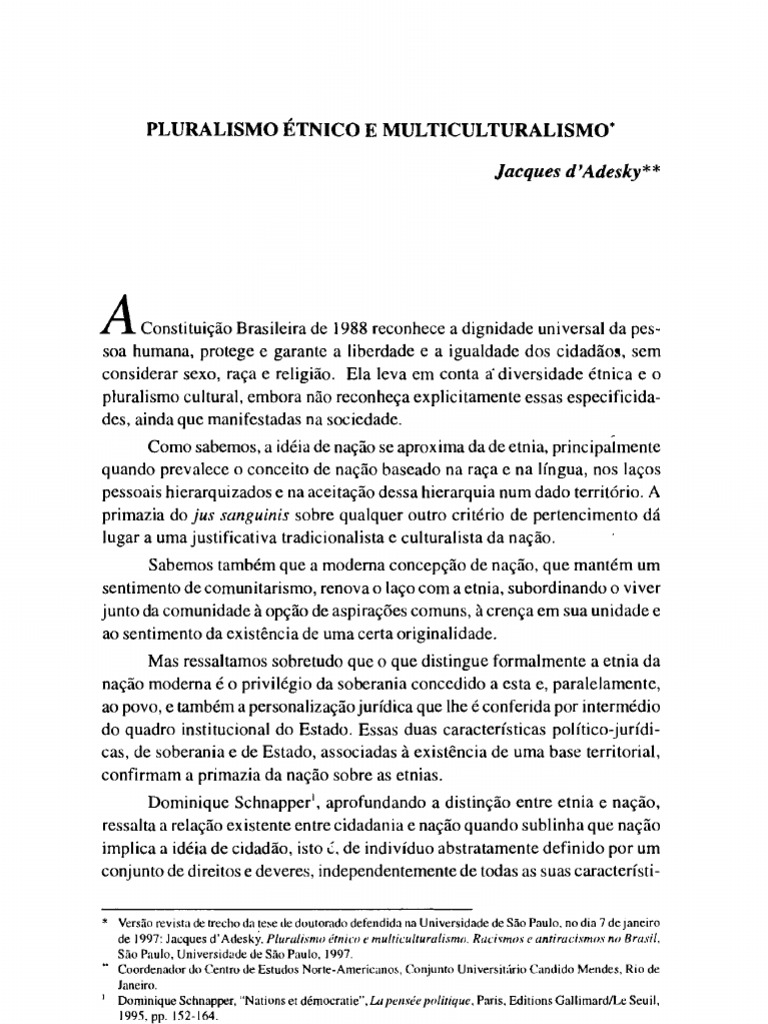 no Bru.i.il. de 1997: Jacques d' Adesky. Plurulisnio irtiir.o c rnultii:ulrurrilrsm,i Ru<:irmov c ~intirricismo.i. So Paulo, Universidade de S5o Paulo. 1997. Coordenador do Centro de Estudos Norte-Americanos, Conjunto Universit;.iGindido Mendes, Rio de Janeiro. Dominique Shnapper. "Nations et dmocratie",LU/~etisie/>olirrque. Paris, Editions GallimardlLe Seuil. 1995. pp. 152-164.