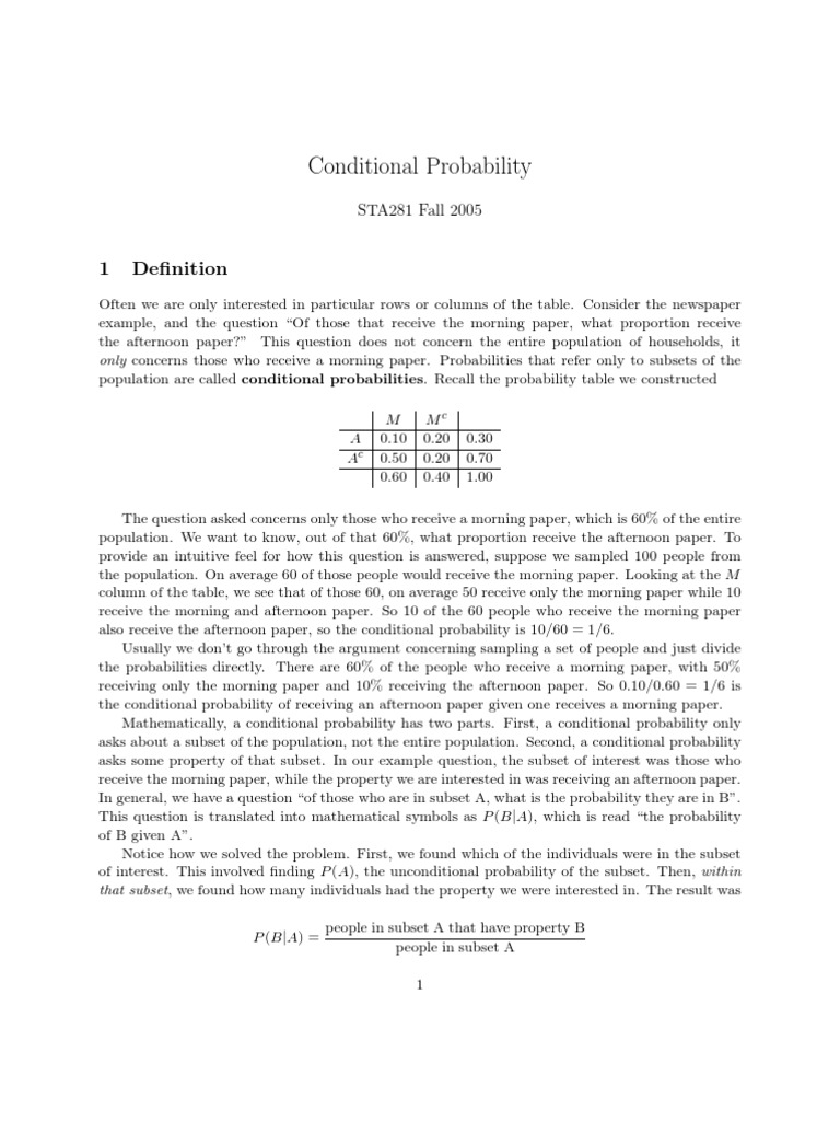The question asked concerns only those who receive a morning paper, which is 60% of the entire population. We want to know, out of that 60%, what proportion receive the afternoon paper. To provide an intuitive feel for how this question is answered, suppose we sampled 100 people from the population. On average 60 of those people would receive the morning paper. Looking at the M column of the table, we see that of those 60, on average 50 receive only the morning paper while 10 receive the morning and afternoon paper. So 10 of the 60 people who receive the morning paper also receive the afternoon paper, so the conditional probability is 10/60 = 1/6. Usually we dont go through the argument concerning sampling a set of people and just divide the probabilities directly. There are 60% of the people who receive a morning paper, with 50% receiving only the morning paper and 10% receiving the afternoon paper. So 0.10/0.60 = 1/6 is the conditional probability of receiving an afternoon paper given one receives a morning paper. Mathematically, a conditional probability has two parts. First, a conditional probability only asks about a subset of the population, not the entire population. Second, a conditional probability asks some property of that subset. In our example question, the subset of interest was those who receive the morning paper, while the property we are interested in was receiving an afternoon paper. In general, we have a question of those who are in subset A, what is the probability they are in B. This question is translated into mathematical symbols as P (B |A), which is read the probability of B given A. Notice how we solved the problem. First, we found which of the individuals were in the subset of interest. This involved nding P (A), the unconditional probability of the subset. Then, within that subset, we found how many individuals had the property we were interested in. The result was P (B |A) = people in subset A that have property B people in subset A 1