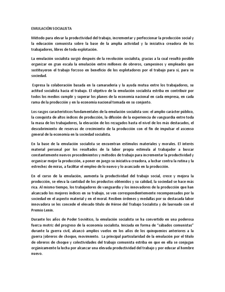 la base de la amplia actividad y la iniciativa creadora de los trabajadores, libres de toda explotacin. La emulacin socialista surgi despus de la revolucin socialista, gracias a la cual result posible organizar en gran escala la emulacin entre millones de obreros, campesinos y empleados que sustituyeron el trabajo forzoso en beneficio de los explotadores por el trabajo para s, para su sociedad. Expresa la colaboracin basada en la camaradera y la ayuda mutua entre los trabajadores, su actitud socialista hacia el trabajo. El objetivo de la emulacin socialista estriba en contribuir por todos los medios cumplir y superar los planes de la economa nacional en cada empresa, en cada rama de la produccin y en la economa nacional tomada en su conjunto. Los rasgos caractersticos fundamentales de la emulacin socialista son: el amplio carcter pblico, la conquista de altos ndices de produccin, la difusin de la experiencia de vanguardia entre toda la masa de los trabajadores, la elevacin de los rezagados hasta el nivel de los ms destacados, el descubrimiento de reservas de crecimiento de la produccin con el fin de impulsar el ascenso general de la economa en la sociedad socialista. En la base de la emulacin socialista se encuentran estmulos materiales y morales. El inters material personal por los resultados de la labor propia estimula al trabajador a buscar constantemente nuevos procedimientos y mtodos de trabajo para incrementar la productividad y organizar mejor la produccin, a poner en juego su iniciativa creadora, a luchar contra la rutina y la estrechez de miras, a facilitar el empleo de lo nuevo y lo avanzado en la produccin. En el curso de la emulacin, aumenta la productividad del trabajo social, crece y mejora la produccin, se eleva la cantidad de los productos obtenidos y su calidad, la sociedad se hace ms rica. Al mismo tiempo, los trabajadores de vanguardia y los innovadores de la produccin que han alcanzado los mejores ndices en su trabajo, se ven correspondientemente recompensados por la sociedad en el aspecto material y en el moral. Reciben rdenes y medallas por su destacada labor innovadora se les concede el elevado ttulo de Hroe del Trabajo Socialista y de laureado con el Premio Lenin. Durante los aos de Poder Sovitico, la emulacin socialista se ha convertido en una poderosa fuerza motriz del progreso de la economa socialista. Iniciada en forma de sbados comunistas durante la guerra civil, alcanz amplios vuelos en los aos de los quinquenios anteriores a la guerra (obreros de choque, movimiento. La principal particularidad de la emulacin por el ttulo de obreros de choque y colectividades del trabajo comunista estriba en que en ella se conjugan orgnicamente la lucha por alcanzar una elevada productividad del trabajo y por educar al hombre nuevo.