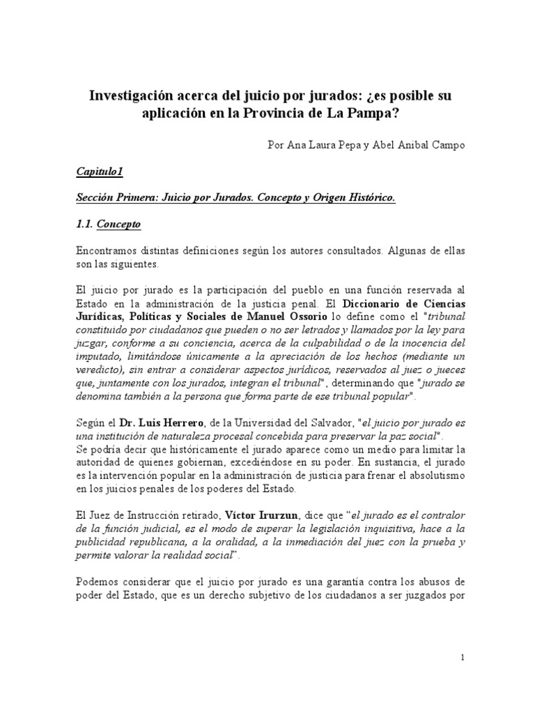 Por Ana Laura Pepa y Abel Anibal Campo Capitulo1 Seccin Primera: Juicio por Jurados. Concepto y Origen Histrico. 1.1. Concepto Encontramos distintas definiciones segn los autores consultados. Algunas de ellas son las siguientes. El juicio por jurado es la participacin del pueblo en una funcin reservada al Estado en la administracin de la justicia penal. El Diccionario de Ciencias Jurdicas, Polticas y Sociales de Manuel Ossorio lo define como el "tribunal constituido por ciudadanos que pueden o no ser letrados y llamados por la ley para juzgar, conforme a su conciencia, acerca de la culpabilidad o de la inocencia del imputado, limitndose nicamente a la apreciacin de los hechos (mediante un veredicto), sin entrar a considerar aspectos jurdicos, reservados al juez o jueces que, juntamente con los jurados, integran el tribunal", determinando que "jurado se denomina tambin a la persona que forma parte de ese tribunal popular". Segn el Dr. Luis Herrero, de la Universidad del Salvador, "el juicio por jurado es una institucin de naturaleza procesal concebida para preservar la paz social". Se podra decir que histricamente el jurado aparece como un medio para limitar la autoridad de quienes gobiernan, excedindose en su poder. En sustancia, el jurado es la intervencin popular en la administracin de justicia para frenar el absolutismo en los juicios penales de los poderes del Estado. El Juez de Instruccin retirado, Vctor Irurzun, dice que el jurado es el contralor de la funcin judicial, es el modo de superar la legislacin inquisitiva, hace a la publicidad republicana, a la oralidad, a la inmediacin del juez con la prueba y permite valorar la realidad social. Podemos considerar que el juicio por jurado es una garanta contra los abusos de poder del Estado, que es un derecho subjetivo de los ciudadanos a ser juzgados por