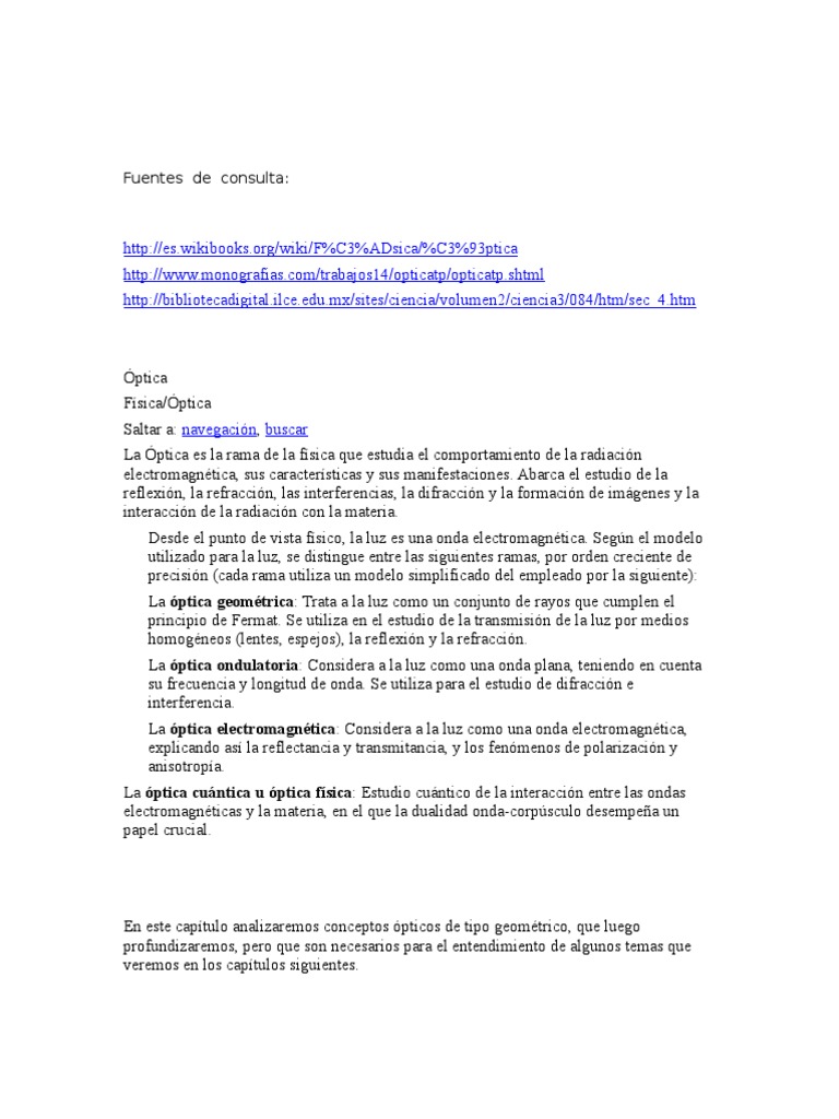 ptica Fsica/ptica Saltar a: navegacin, buscar La ptica es la rama de la fsica que estudia el comportamiento de la radiacin electromagntica, sus caractersticas y sus manifestaciones. Abarca el estudio de la reflexin, la refraccin, las interferencias, la difraccin y la formacin de imgenes y la interaccin de la radiacin con la materia. Desde el punto de vista fsico, la luz es una onda electromagntica. Segn el modelo utilizado para la luz, se distingue entre las siguientes ramas, por orden creciente de precisin (cada rama utiliza un modelo simplificado del empleado por la siguiente): La ptica geomtrica: Trata a la luz como un conjunto de rayos que cumplen el principio de Fermat. Se utiliza en el estudio de la transmisin de la luz por medios homogneos (lentes, espejos), la reflexin y la refraccin. La ptica ondulatoria: Considera a la luz como una onda plana, teniendo en cuenta su frecuencia y longitud de onda. Se utiliza para el estudio de difraccin e interferencia. La ptica electromagntica: Considera a la luz como una onda electromagntica, explicando as la reflectancia y transmitancia, y los fenmenos de polarizacin y anisotropa. La ptica cuntica u ptica fsica: Estudio cuntico de la interaccin entre las ondas electromagnticas y la materia, en el que la dualidad onda-corpsculo desempea un papel crucial.