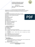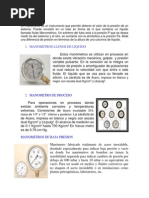 EL MANMETRO El manmetro es un instrumento utilizado para la medicin de la presin en los fluidos, generalmente determinando la diferencia de la presin entre el fluido y la presin local. En la mecnica la presin se define como la fuerza por unidad de superficie que ejerce un lquido o un gas perpendicularmente a dicha superficie. La presin suele medirse en atmsferas, en el sistema internacional de unidades, la presin se expresa en newton por metro cuadrado; un newton por metro cuadrado es un pascal (Pa). La atmsfera se define como 101.325 Pa, y equivale a 760 mm de mercurio en un barmetro convencional. Cuando los manmetros deben indicar fluctuaciones rpidas de presin se suelen utilizar sensores piezoelctricos o electrostticos que proporcionan una respuesta instantnea. MANMETRO DE BURDON: Instrumento mecnico de medicin de presiones que emplea como elemento sensible un tubo metlico curvado o torcido, de seccin transversal aplanada. Un extremo del tubo est cerrado, y la presin que se va a medir se aplica por el otro extremo. A medida que la presin aumenta, el tubo tiende a adquirir una seccin circular y enderezarse. El movimiento del extremo libre (cerrado) mide la presin interior y provoca el movimiento de la aguja. El principio fundamental de que el movimiento del tubo es proporcional a la presin fue propuesto por el inventor francs Eugene Burdon en el siglo XIX. Los manmetros Burdon se utilizan tanto para presiones manomtricas que oscilan entre 0-1 Kg/cm2 como entre 0-10000 Kg/cm2 y tambin para vaco. Los tubos Burdon se presentan en una serie de aleaciones de cobre y en aceros inoxidables al cromo nquel. En ciertos aspectos las aleaciones de cobre dan mejor resultado, pero los aceros inoxidables ofrecen mayor resistencia a la corrosin. Los manmetros Burdon miden la diferencia entre la presin interior y la exterior del tubo. Como la presin exterior suele ser la atmosfrica, el manmetro indica la diferencia existente entre la presin medida y la presin atmosfrica, es decir la presin manomtrica.