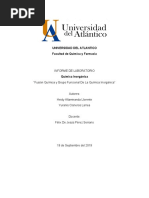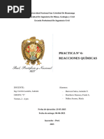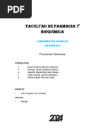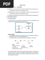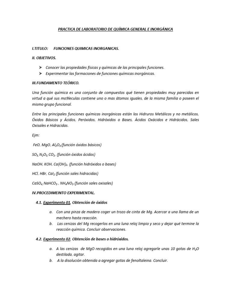 II. OBJETIVOS. Conocer las propiedades fsicas y qumicas de las principales funciones. Experimentar las formaciones de funciones qumicas inorgnicas. [Link] TERICO. Una funcin qumica es una conjunto de compuestos qu tienen propiedades muy parecidas en virtud a qu sus mo9leculas contiene uno o mas tomos iguales, de la misma familia o poseen el mismo grupo funcional. Entre las principales funciones qumicas inorgnicas estn los Hidruros Metlicos y no metlicos, xidos Bsicos y cidos, Perxidos, Hidrxidos o Bases, cidos Oxcidos e Hidrcidos, Sales Oxisales e Hidracidas. Ejm: FeO, MgO, Al2O3 (funcin xidos bsicos) SO3, N2O3, CO2, (funcin xidos cidos) NaOH, KOH, Ca(OH)2, (funcin hidrxidos o bases) HCl, HBr, CaI2 (funcin sales hidracidas) CaSO4, NaHCO3 , NH4NO3 (funcin sales oxisales) [Link] EXPERIMENTAL. 4.1. Experimento 01. Obtencin de xidos a. Con una pinza de madera coger un trozo de cinta de Mg. Acercar a una llama de un mechero hasta reaccin. b. Las cenizas del Mg recogerlos en una luna reloj limpio y seco y dejar qu termine la reaccin qumica. Concluir observaciones. 4.2. Experimento 02. Obtencin de bases o hidrxidos. a. A las cenizas de MgO recogidos en una luna reloj agregarle unas 10 gotas de H2O destilada, agitar. b. A la disolucin obtenida a agregar gotas de fenoltaleina. Concluir.