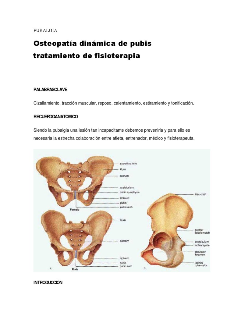 PALABRASCLAVE Cizallamiento, traccin muscular, reposo, calentamiento, estiramiento y tonificacin. RECUERDOANATMICO Siendo la pubalgia una lesin tan incapacitante debemos prevenirla y para ello es necesaria la estrecha colaboracin entre atleta, entrenador, mdico y fisioterapeuta.