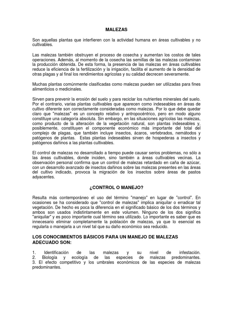 Son aquellas plantas que interfieren con la actividad humana en reas cultivables y no cultivables. Las malezas tambin obstruyen el proceso de cosecha y aumentan los costos de tales operaciones. Adems, al momento de la cosecha las semillas de las malezas contaminan la produccin obtenida. De esta forma, la presencia de las malezas en reas cultivables reduce la eficiencia de la fertilizacin y la irrigacin, facilita el aumento de la densidad de otras plagas y al final los rendimientos agrcolas y su calidad decrecen severamente. Muchas plantas comnmente clasificadas como malezas pueden ser utilizadas para fines alimenticios o medicinales. Sirven para prevenir la erosin del suelo y para reciclar los nutrientes minerales del suelo. Por el contrario, varias plantas cultivables que aparecen como indeseables en reas de cultivo diferente son correctamente consideradas como malezas. Por lo que debe quedar claro que "malezas" es un concepto relativo y antropocntrico, pero en modo alguno constituye una categora absoluta. Sin embargo, en las situaciones agrcolas las malezas, como producto de la alteracin de la vegetacin natural, son plantas indeseables y, posiblemente, constituyen el componente econmico ms importante del total del complejo de plagas, que tambin incluye insectos, caros, vertebrados, nemtodos y patgenos de plantas. Estas plantas indeseables sirven de hospederas a insectos y patgenos dainos a las plantas cultivables. El control de malezas no desarrollado a tiempo puede causar serios problemas, no slo a las reas cultivables, donde inciden, sino tambin a reas cultivables vecinas. La observacin personal confirma que un control de malezas retardado en caa de azcar, con un desarrollo avanzado de insectos dainos sobre las malezas presentes en las reas del cultivo indicado, provoca la migracin de los insectos sobre reas de pastos adyacentes.