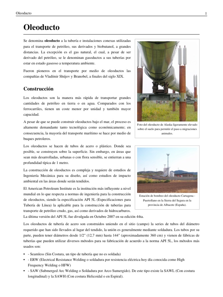 Los oleoductos son la manera ms rpida de transportar grandes cantidades de petrleo en tierra o en agua. Comparados con los ferrocarriles, tienen un coste menor por unidad y tambin mayor capacidad. A pesar de que se puede construir oleoductos bajo el mar, el proceso es altamente demandante tanto tecnolgica como econmicamente; en consecuencia, la mayora del transporte martimo se hace por medio de buques petroleros. Los oleoductos se hacen de tubos de acero o plstico. Donde sea posible, se construyen sobre la superficie. Sin embargo, en reas que sean ms desarrolladas, urbanas o con flora sensible, se entierran a una profundidad tpica de 1 metro. La construccin de oleoductos es compleja y requiere de estudios de Ingeniera Mecnica para su diseo, as como estudios de impacto ambiental en las reas donde sern tendidos. El American Petroleum Institute es la institucin ms influyente a nivel mundial en lo que respecta a normas de ingeniera para la construccin Estacin de bombeo del oleoducto Cartagena de oleoductos, siendo la especificacin API 5L (Especificaciones para Puertollano en la Sierra del Segura en la provincia de Albacete (Espaa). Tubera de Lnea) la aplicable para la construccin de tuberas para transporte de petrleo crudo, gas, as como derivados de hidrocarburos. La ltima versin del API 5L fue divulgada en Octubre 2007 en su edicin 44ta. Los oleoductos de tubera de acero son construidos uniendo en el sitio (campo) la series de tubos del dimetro requerido que han sido llevados al lugar del tendido, la unin es generalmente mediante soldadura. Los tubos por su parte, pueden tener dimetros desde 1/2" (12,7 mm) hasta 144" (aproximadamente 360 cm) y vienen de fbricas de tuberas que pueden utilizar diversos mtodos para su fabricacin de acuerdo a la norma API 5L, los mtodos ms usados son: - Seamless (Sin Costura, un tipo de tubera que no es soldada) - ERW (Electrical Resistance Welding o soldadura por resistencia elctrica hoy da conocida como High Frequency Welding o HFW) - SAW (Submerged Arc Welding o Soldadura por Arco Sumergido). De este tipo existe la SAWL (Con costura longitudinal) y la SAWH (Con costura Helicoidal o en Espiral).