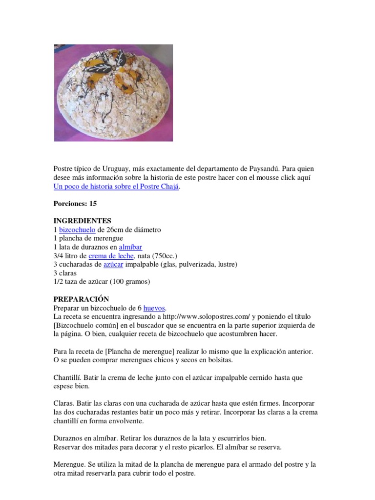 Para quien desee ms informacin sobre la historia de este postre hacer con el mousse click aqu Un poco de historia sobre el Postre Chaj. Porciones: 15 INGREDIENTES 1 bizcochuelo de 26cm de dimetro 1 plancha de merengue 1 lata de duraznos en almbar 3/4 litro de crema de leche, nata (750cc.) 3 cucharadas de azcar impalpable (glas, pulverizada, lustre) 3 claras 1/2 taza de azcar (100 gramos) PREPARACIN Preparar un bizcochuelo de 6 huevos. La receta se encuentra ingresando a http://www.solopostres.com/ y poniendo el ttulo [Bizcochuelo comn] en el buscador que se encuentra en la parte superior izquierda de la pgina. O bien, cualquier receta de bizcochuelo que acostumbren hacer. Para la receta de [Plancha de merengue] realizar lo mismo que la explicacin anterior. O se pueden comprar merengues chicos y secos en bolsitas. Chantill. Batir la crema de leche junto con el azcar impalpable cernido hasta que espese bien. Claras. Batir las claras con una cucharada de azcar hasta que estn firmes. Incorporar las dos cucharadas restantes batir un poco ms y retirar. Incorporar las claras a la crema chantill en forma envolvente. Duraznos en almbar. Retirar los duraznos de la lata y escurrirlos bien. Reservar dos mitades para decorar y el resto picarlos. El almbar se reserva. Merengue. Se utiliza la mitad de la plancha de merengue para el armado del postre y la otra mitad reservarla para cubrir todo el postre.