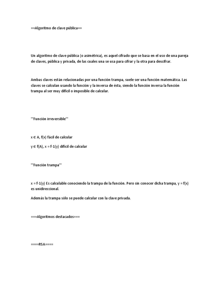 Un algoritmo de clave pblica (o asimtrica), es aquel cifrado que se basa en el uso de una pareja de claves, pblica y privada, de las cuales una se usa para cifrar y la otra para descifrar.