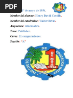 Toda persona quiere disear algo que otras personas puedan leer. La calidad de su trabajo puede influir mucho en sus ingresos, en lo profesional, e incluso en como las personas te puedan tratar. Muchas personas no poseemos ese don divino de ser diseadores, pero con Publisher esto no ser problema, pues tendr a la mano una diversidad de plantillas para publicaciones. Cundo usar Publisher 2007? Aunque existen muchos programas superiores a Publisher como un Corel Draw, Adobe Illustrator, Adobe Indesign, muchas personas utilizan para sus publicaciones a Microsoft Word, y la gran mayora est contento con ello. La pregunta es Por qu utilizar Publisher si Word hace todo lo que necesito? Pues as como la pregunta es sencilla, la respuesta es aun ms sencilla; con Publisher 2007 tendr el control total de los elementos insertados en la pgina, algo que Word no podr hacerlo tan fcilmente. Trabajar con un diseo de publicacin Para poder trabajar con algn programa que permita hacer diseos de publicacin, debera utilizar diversos elementos en una misma publicacin como muestra la siguiente imagen. Texto: Un texto es toda letra o carcter que forma una palabra, frase, oracin, o prrafos. WordArt: Publisher 2007 incluye WordArt, que permite aadir algunas apariencias y efectos a su texto. Imgenes: Las imgenes reflejan el buen estilo de una publicacin, y puede insertar una gran cantidad de imgenes, ya que Publisher 2007 soporta distintos formatos, como JPG, TIF, PNG, BMP, etc. Prof. David Luduea Esc. Dr. Dalmacio Vlez Srsfield Nivel Superior