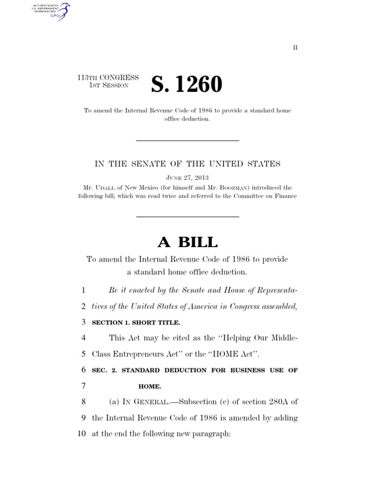 To amend the Internal Revenue Code of 1986 to providea standard home office deduction.