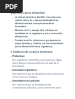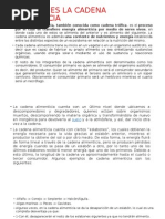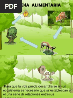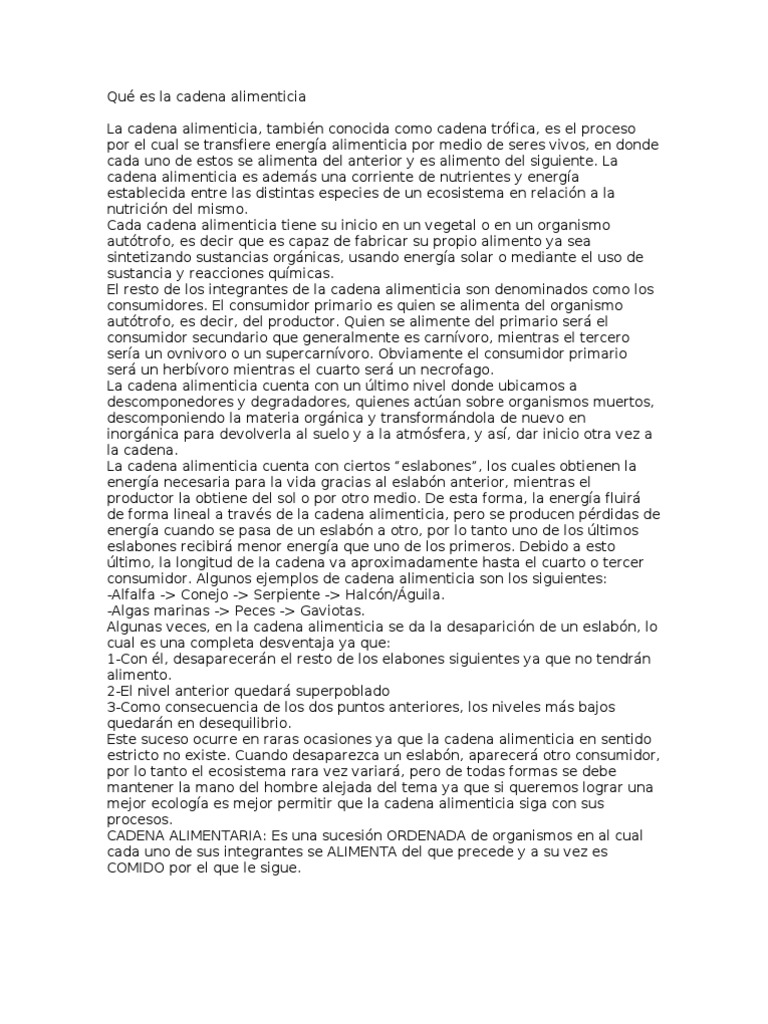 por medio de seres vivos, en donde cada uno de estos se alimenta del anterior y es alimento del siguiente. La cadena alimenticia es adems una corriente de nutrientes y energa establecida entre las distintas especies de un ecosistema en relacin a la nutricin del mismo. Cada cadena alimenticia tiene su inicio en un vegetal o en un organismo auttrofo, es decir que es capaz de fabricar su propio alimento ya sea sintetizando sustancias orgnicas, usando energa solar o mediante el uso de sustancia y reacciones qumicas. El resto de los integrantes de la cadena alimenticia son denominados como los consumidores. El consumidor primario es quien se alimenta del organismo auttrofo, es decir, del productor. Quien se alimente del primario ser el consumidor secundario que generalmente es carnvoro, mientras el tercero sera un ovnivoro o un supercarnvoro. Obviamente el consumidor primario ser un herbvoro mientras el cuarto ser un necrofago. La cadena alimenticia cuenta con un ltimo nivel donde ubicamos a descomponedores y degradadores, quienes actan sobre organismos muertos, descomponiendo la materia orgnica y transformndola de nuevo en inorgnica para devolverla al suelo y a la atmsfera, y as, dar inicio otra vez a la cadena. La cadena alimenticia cuenta con ciertos eslabones, los cuales obtienen la energa necesaria para la vida gracias al eslabn anterior, mientras el productor la obtiene del sol o por otro medio. De esta forma, la energa fluir de forma lineal a travs de la cadena alimenticia, pero se producen prdidas de energa cuando se pasa de un eslabn a otro, por lo tanto uno de los ltimos eslabones recibir menor energa que uno de los primeros. Debido a esto ltimo, la longitud de la cadena va aproximadamente hasta el cuarto o tercer consumidor. Algunos ejemplos de cadena alimenticia son los siguientes: -Alfalfa -> Conejo -> Serpiente -> Halcn/guila. -Algas marinas -> Peces -> Gaviotas. Algunas veces, en la cadena alimenticia se da la desaparicin de un eslabn, lo cual es una completa desventaja ya que: 1-Con l, desaparecern el resto de los elabones siguientes ya que no tendrn alimento. 2-El nivel anterior quedar superpoblado 3-Como consecuencia de los dos puntos anteriores, los niveles ms bajos quedarn en desequilibrio. Este suceso ocurre en raras ocasiones ya que la cadena alimenticia en sentido estricto no existe. Cuando desaparezca un eslabn, aparecer otro consumidor, por lo tanto el ecosistema rara vez variar, pero de todas formas se debe mantener la mano del hombre alejada del tema ya que si queremos lograr una mejor ecologa es mejor permitir que la cadena alimenticia siga con sus procesos. CADENA ALIMENTARIA: Es una sucesin ORDENADA de organismos en al cual cada uno de sus integrantes se ALIMENTA del que precede y a su vez es COMIDO por el que le sigue.