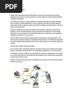 Una Cadena Alimentaria est FORMADA por: - PRODUCTORES (Plantas). Son los que fabrican su propio alimento. - CONSUMIDORES (Animales y el Hombre). Son los que consumen el alimento fabricado por las Auttrofos, que pueden ser HERBVOROS, CARNVOROS u OMNVOROS. - DESCOMPONEDORES (Hongos y Bacterias). Son los que descomponen la materia orgnica en inorgnica para formar el HUMUS o tierra negra. Por ejemplo: Hoja ---> Langosta ----> Sapo -----> Vbora ----> guila ----> Descomponedores (Hongos y Bacterias) La Hoja es el PRODUCTOR, que fabrica el alimento y es comida por la Langosta que es un CONSUMIDOR Primario, que es herbvoro. La Langosta es comida por la Araa que es un Consumidor Secundario y Carnvoro. La Araa es comida por el Sapo, que es un Consumidor Terciario y Carnvoro. Al Sapo se lo come la Vbora que es un Consumidor de 4to Orden y Carnvoro y luego el guila se come a la Vbora y es un Consumidor de 5to Orden y Carnvoro. Finalmente actan los Descomponedores (Hongos y Bacterias) y descomponen la materia orgnica para transformarla en inorgnica cuando algn miembro de la cadena muere. La RELACIN TRFICA entre organismos que forman una CADENA ALIMENTARIA se establece en primer lugar por los VEGETALES o PLANTAS (AUTTROFOS o PRODUCTORES, que elaboran su propio alimento a travs del Proceso de FOTOSNTESIS. Ese alimento llamado ALMIDN que queda almacenado en todos los rganos de la planta, es consumido por las plantas en parte y el resto sirve de alimento a los ANIMALES (HETERTROFOS o CONSUMIDORES). Por ejemplo: Un vegetal o Auttrofo fabrica almidn que queda en la hoja. Luego se acerca la LANGOSTA y consume un trozo de hoja. La langosta (CONSUMIDOR PRIMARIO o HERBVORO) ha consumido de las plantas el alimento, ya que no lo puede fabricar y necesita forzosamente de los Productores. A la Langosta se la come un SAPO (CONSUMIDOR SECUNDARIO o CARNVORO). Luego al Sapo se lo come la VBORA (CONSUMIDOR TERCIARIO o CARNVORO) y as sucesivamente hasta que con la muerte de alguno de estos integrantes de la cadena muere y recin actan los DESCOMPONEDORES (HONGOS y BACTERIAS) que se alimentan de las sustancias orgnicas para luego transformarlas en inorgnicas y volver a iniciar el ciclo alimentario. En cuanto a la ENERGA: En una CADENA ALIMENTARIA la ENERGA LUMINOSA es captada por los vegetales que la transforman en ENERGA QUMICA que queda almacenada en el alimento. Al consumir una Langosta (Consumidor 1) ese vegetal consume Energa Qumica y si esa langosta es comida por un Sapo (Consumidor 2) consume tambin ENERGA QUMICA y as sucesivamente entre los distintos integrantes de una cadena alimentaria hasta llegar a los Descomponedores que transforman la materia orgnica en inorgnica y devuelven al medio la ENERGA QUMICA para iniciar nuevamente el ciclo.