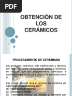 Secado y eliminacin del aglutinante. El propsito del secado de cermicos es eliminar agua del cuerpo cermico plstico antes de ser sometidas a altas temperaturas. Generalmente, la eliminacin de agua .se lleva a cabo a menos de 100 C y puede tardar alrededor de 24 horas para un trozo de cermica grande. La mayora de los cimentadores orgnicos pueden extraerse de las piezas cermicas por calentamiento en el rango de 200 a 300 C; aunque algunos residuos hidrocarburazos pueden requerir un calentamiento a temperaturas mucho ms elevadas. Sinterizacin. El proceso por el que se consigue que pequeas partculas de un material se mantengan unidas por difusin en estado .slido se llama sinterizacin. En la fabricacin de cermicos este tratamiento trmico se basa en la transformacin de un producto poroso compacto en otro denso y coherente. La sinterizacin se utiliza de modo generalizado para producir formas cermicas fabricadas de, por ejemplo, almina, berilio, ferritas y titanatos. En el proceso de sinterizacin las partculas coalescen por difusin en estado slido a temperaturas muy altas pero por debajo del punto de fusin del compuesto que se desea sinterizar. Por ejemplo, la buja de aislante de almina mostrada en la Figura 11.26 se sinteriza a 1,600 C (el punto de fusin de la almina es de 2050 C). En la sinterizacin. la difusin atmica tiene l u g a r entre las superficies de contacto de las partculas a fin de que resulten qumicamente unidas(figura 11.29).a medida que el proceso continua, las partculas mas grandes se forman a expensas de las mas pequeas, como se muestra en la sinterizacin del compuesto MgO mostrado en la figura 11.30 (a) (b) (c).