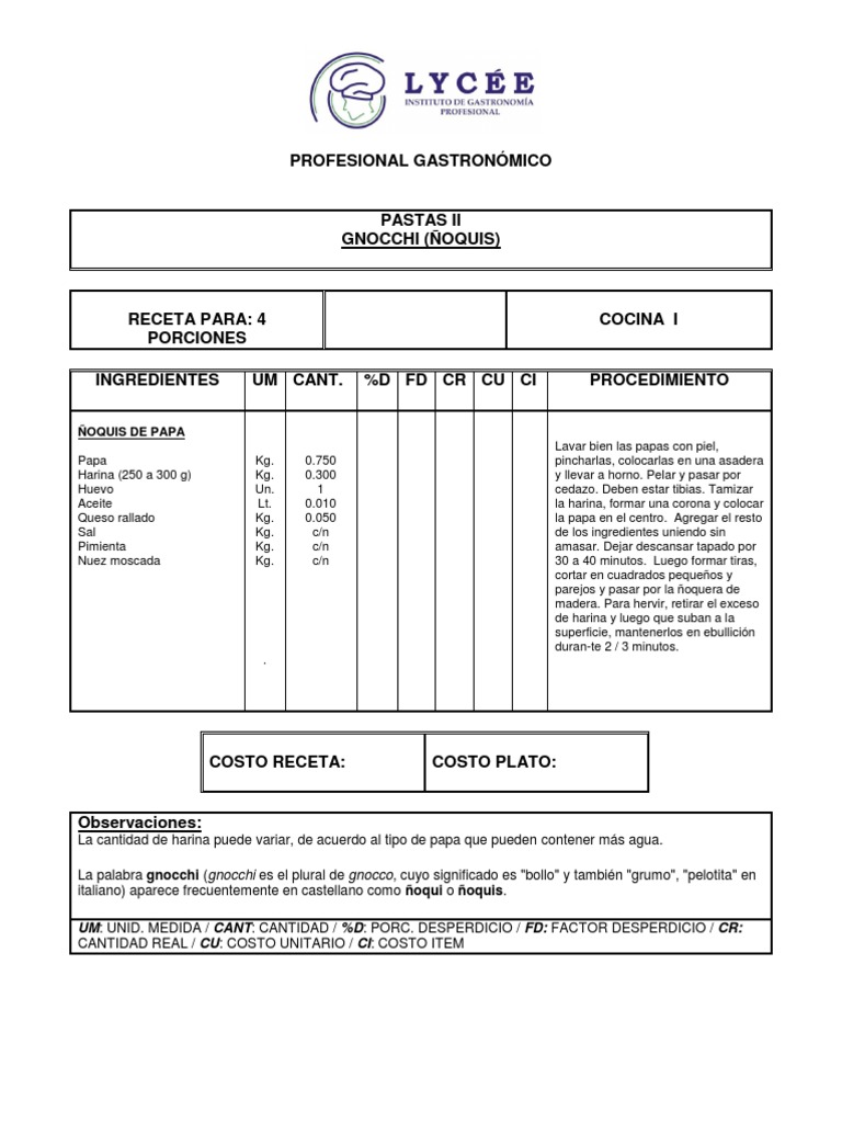 La cantidad de harina puede variar, de acuerdo al tipo de papa que pueden contener ms agua. La palabra gnocchi (gnocchi es el plural de gnocco, cuyo significado es "bollo" y tambin "grumo", "pelotita" en italiano) aparece frecuentemente en castellano como oqui o oquis. UM: UNID. MEDIDA / CANT: CANTIDAD / %D: PORC. DESPERDICIO / FD: FACTOR DESPERDICIO / CR: CANTIDAD REAL / CU: COSTO UNITARIO / CI: COSTO ITEM