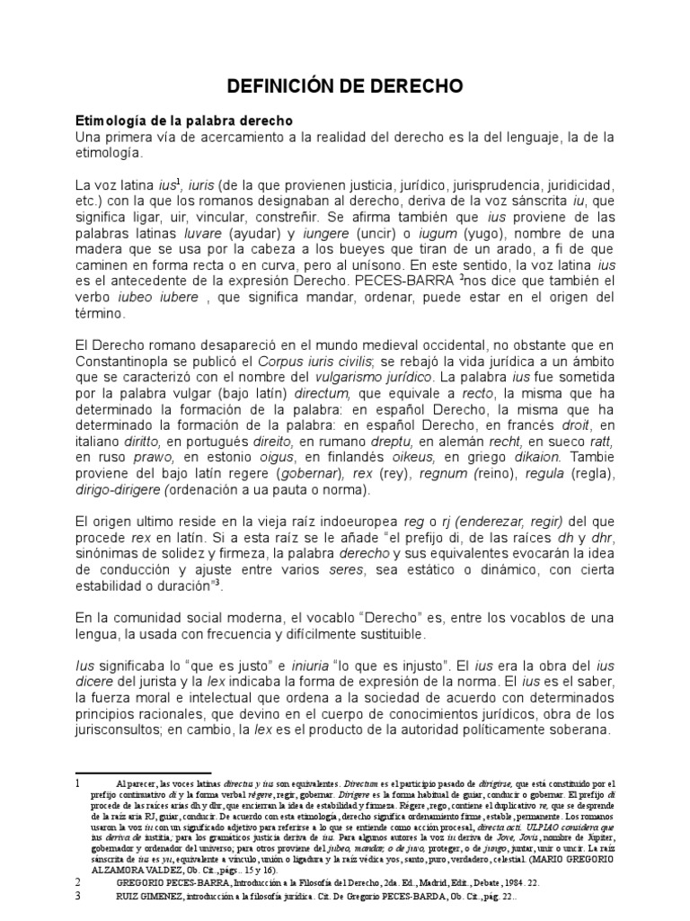 Al parecer, las voces latinas directus y ius son equivalentes. Directum es el participio pasado de dirigirse, que est constituido por el prefijo continuativo di y la forma verbal rgere, regir, gobernar. Dirigere es la forma habitual de guiar, conducir o gobernar. El prefijo di procede de las races arias dh y dhr, que encierran la idea de estabilidad y firmeza. Rgere, rego, contiene el duplicativo re, que se desprende de la raz aria RJ, guiar, conducir. De acuerdo con esta etimologa, derecho significa ordenamiento firme, estable, permanente. Los romanos usaron la voz iu con un significado adjetivo para referirse a lo que se entiende como accin procesal, directa acti. ULPIAO considera que ius deriva de iustitia; para los gramticos justicia deriva de ius. Para algunos autores la voz iu deriva de Jove, Jovis, nombre de Jpiter, gobernador y ordenador del universo; para otros proviene del jubeo, mandar, o de juvo, proteger, o de jungo, juntar, unir o uncir. La raz snscrita de ius es yu, equivalente a vnculo, unin o ligadura y la raz vdica yos, santo, puro, verdadero, celestial. (MARIO GREGORIO ALZAMORA VALDEZ, Ob. Cit., pgs.. 15 y 16). GREGORIO PECES-BARRA, Introduccin a la Filosofa del Derecho, 2da. Ed., Madrid, Edit., Debate, 1984. 22. RUIZ GIMENEZ, introduccin a la filosofa jurdica. Cit. De Gregorio PECES-BARDA, Ob. Cit., pg. 22..