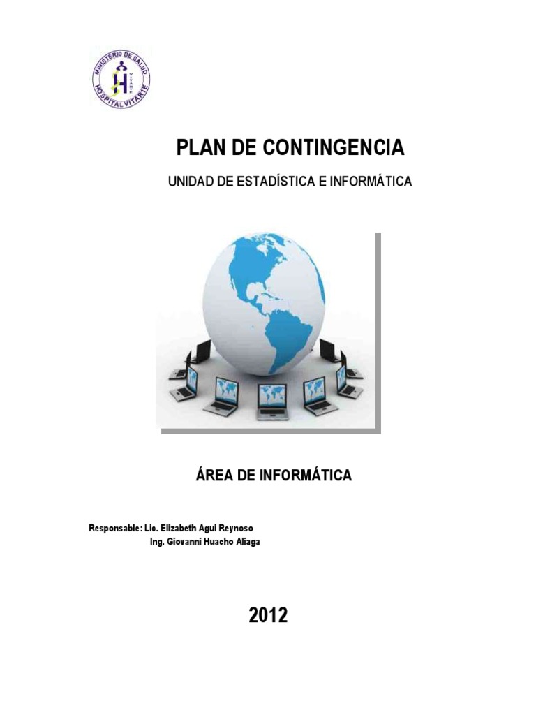 II. DEFINICIN: Es un tipo de plan preventivo, predictivo y reactivo. Presenta una estructura estratgica y operativa que ayudar a controlar una situacin de emergencia y a minimizar sus consecuencias negativas. El plan de contingencia propone una serie de procedimientos alternativos al funcionamiento normal de la organizacin, cuando alguna de sus funciones usuales se ve perjudicada por una contingencia interna o externa. Esta clase de plan, por lo tanto, intenta garantizar la continuidad del funcionamiento de la organizacin frente a cualquier eventualidad, ya sean materiales o personales. Un plan de contingencia incluye cuatro etapas bsicas: la evaluacin, la planificacin, las pruebas de viabilidad y la ejecucin. III. DIAGNOSTICO SITUACIONAL: Actualmente el Hospital Vitarte cuenta con los siguientes Equipos de Cmputo: A. Hardware: 05 UPS 286 Computadoras 85 Impresoras 09 Escaner 09 Laptop
