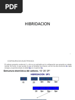 HIBRIDACIN HIBRIDACIN sp3 Cuando el tomo de carbono se combina con otros cuatro tomos, segn Pauling, el tomo de carbono se dispone situando cada uno de los cuatro electrones de valencia en uno de los cuatro orbitales idnticos que se forman a partir del orbital 2s y de los tres orbitales 2p. El proceso se denomina hibridacin, y cada uno de los cuatro orbitales formados es un orbital hbrido sp3.